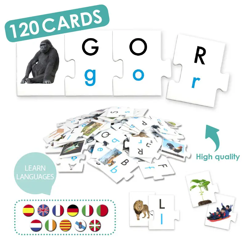 - ✅ Include 32 tessere fotografiche realistiche e 88 tessere alfabeto per costruire e associare parole.
