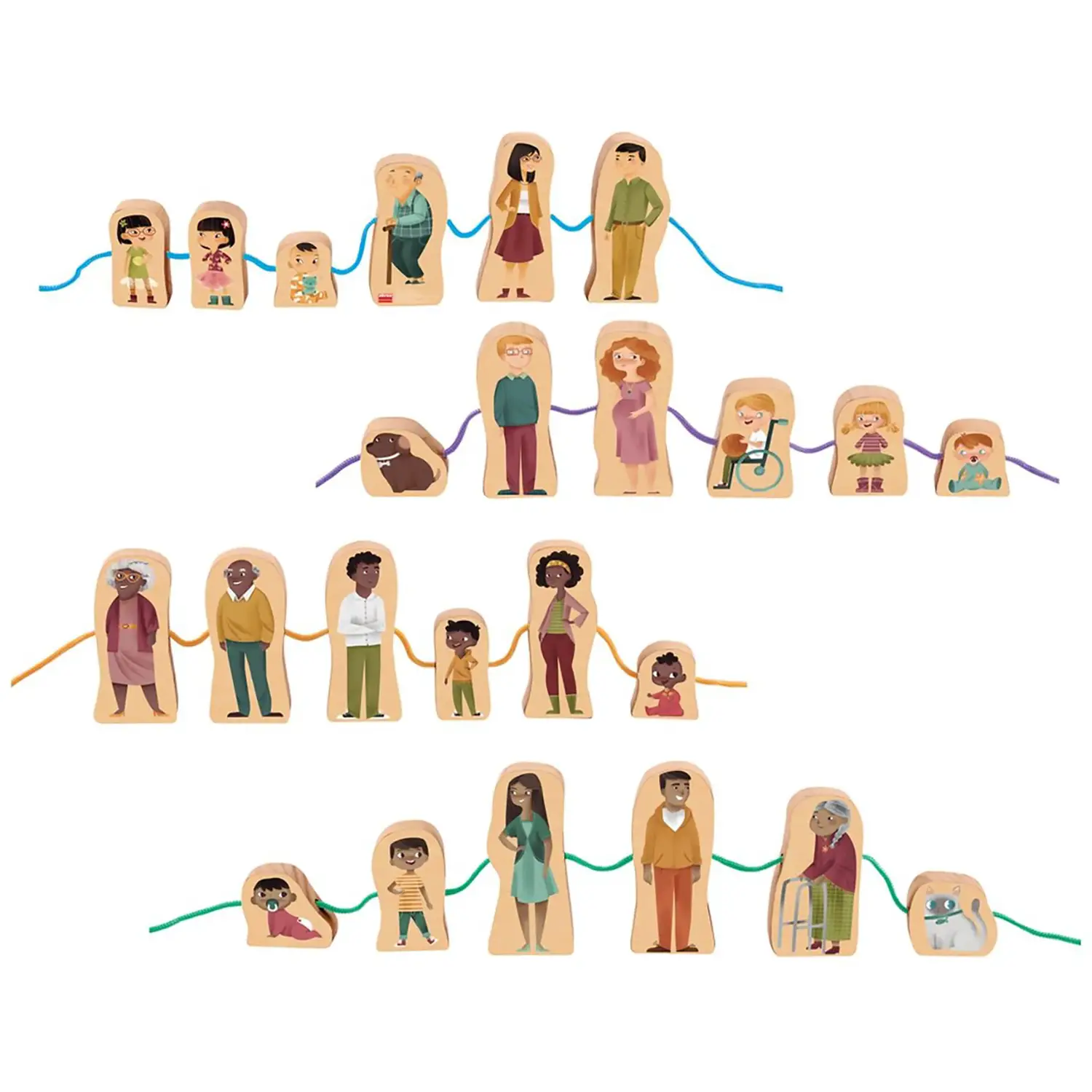 Un set educativo pensato per far scoprire ai bambini la bellezza della diversità culturale attraverso un’attività manuale di infilatura. Il set include 24 figure in legno che rappresentano quattro famiglie provenienti da diverse parti del mondo: europea, asiatica, africana e sudamericana.