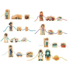 Un set educativo che permette ai bambini di scoprire e conoscere una varietà di mestieri provenienti da tutto il mondo attraverso il gioco di infilatura. Il set comprende 24 figure in legno che rappresentano personaggi riconoscibili grazie alle loro divise o uniformi tipiche.
