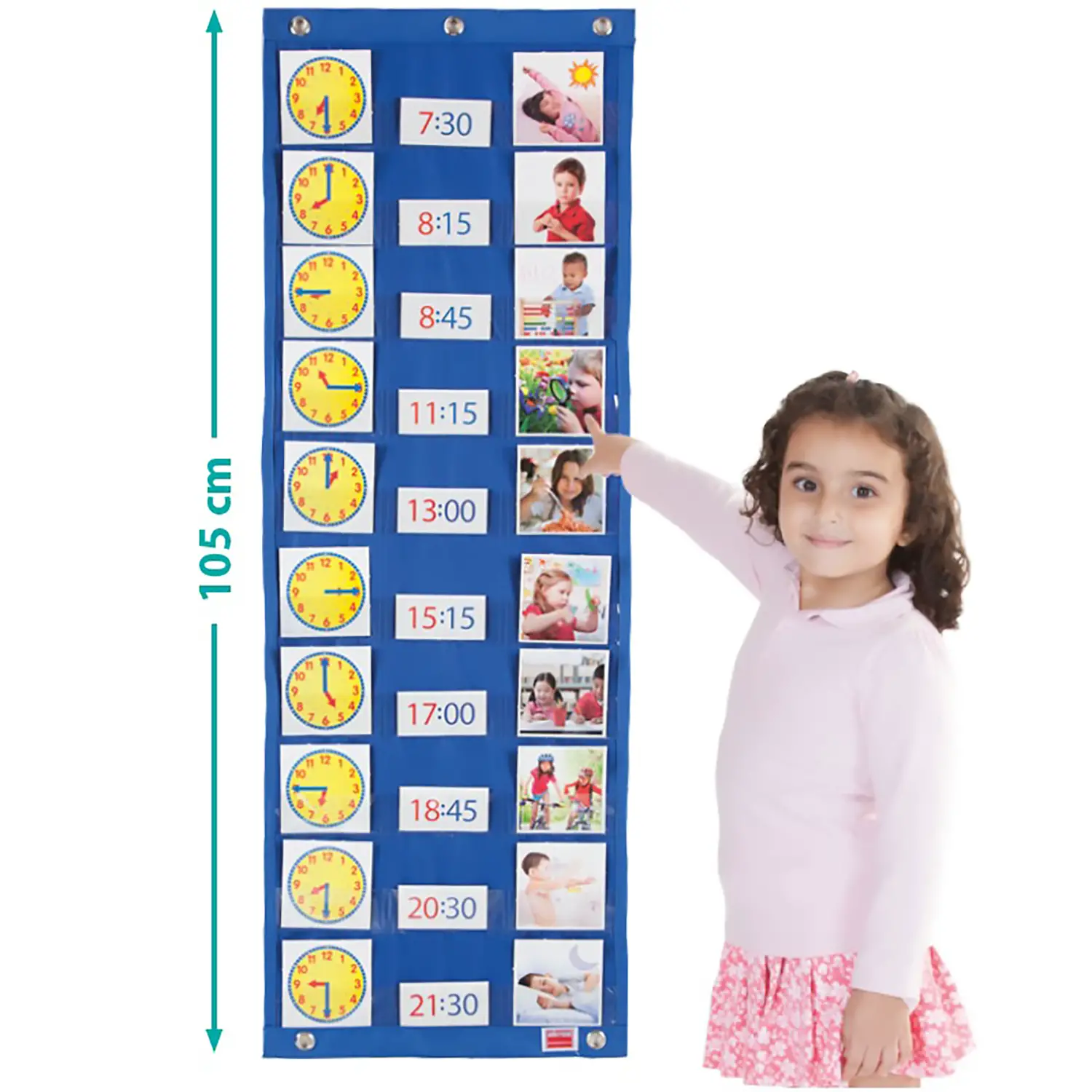 I bambini scelgono le tessere delle attività quotidiane e le inseriscono nelle tasche in base agli orari, creando il proprio planner giornaliero personalizzato. Un modo pratico e divertente per imparare a organizzare la giornata.