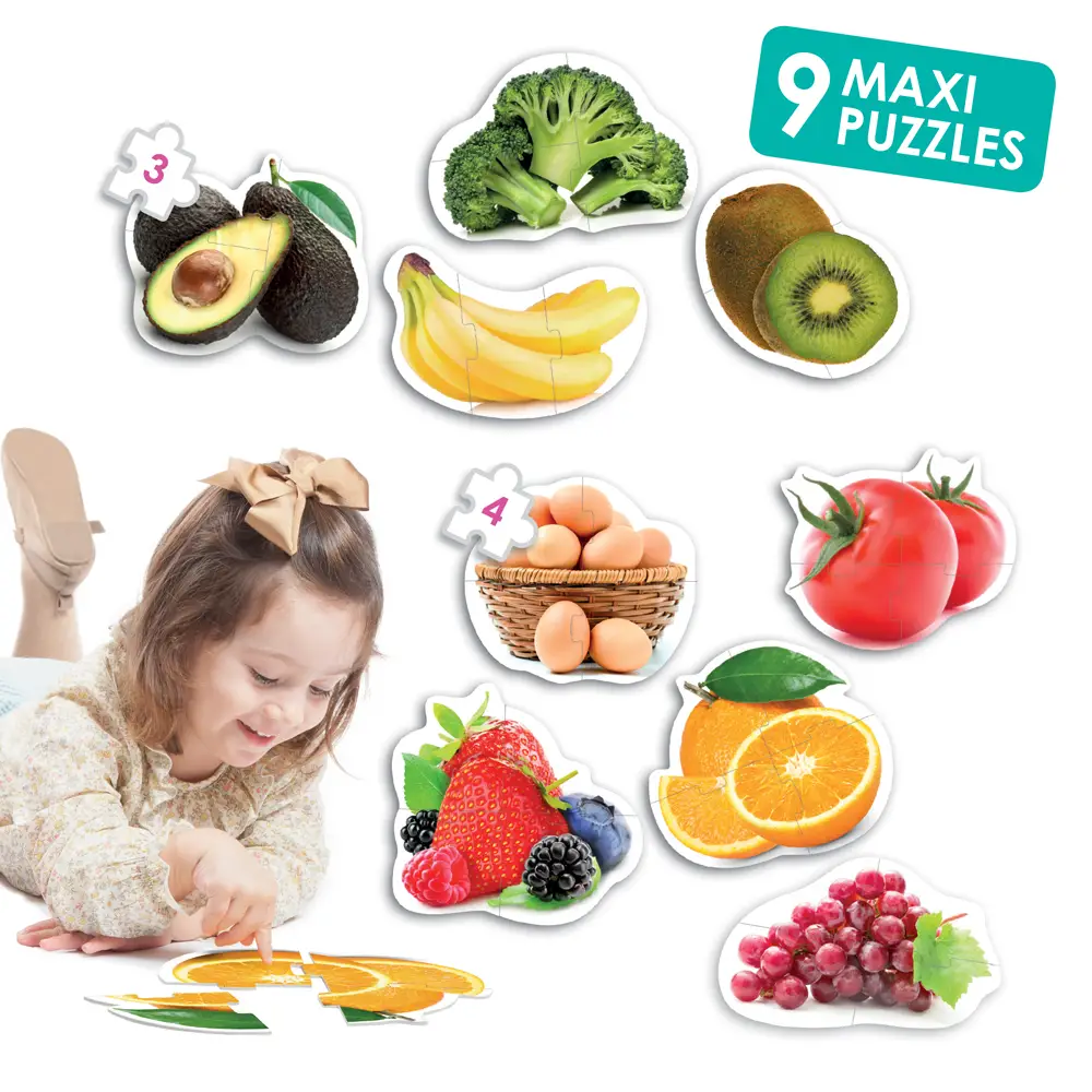 Un Puzzle Cartone Maxi Cibi Sani che unisce divertimento e apprendimento, ideale per insegnare ai bambini l’importanza dei cibi sani, motricità e osservazione, trasformando ogni attività in un momento educativo e interattivo.