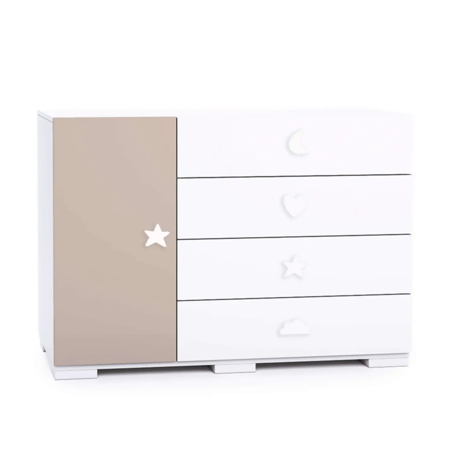 Cassetti: pannello truciolare melaminico. Guide metalliche. Cassetti frontali: MDF laccato (18 mm). Ripiano: vassoio in particelle di melamina (18 mm). Angoli applicati con PVC da 0,4 mm. Maniglie delle porte: MDF (12 mm) laccato. Anta: MDF (18 mm) laccato.