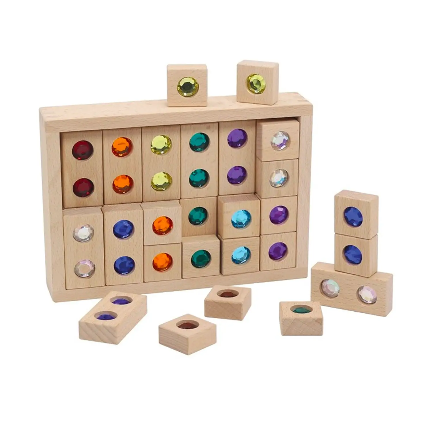 - Contenuto: 32 blocchi in legno con gemme acriliche colorate