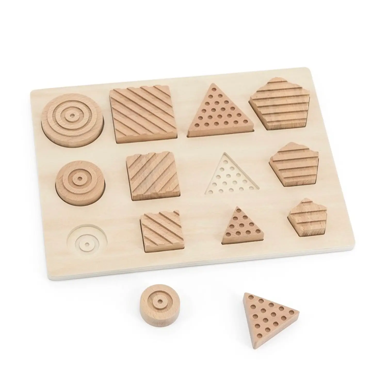 - Composizione Variata: Include 12 pezzi con 4 forme geometriche, 4 texture in rilievo e 3 dimensioni distinte per esercitare la percezione e la classificazione.