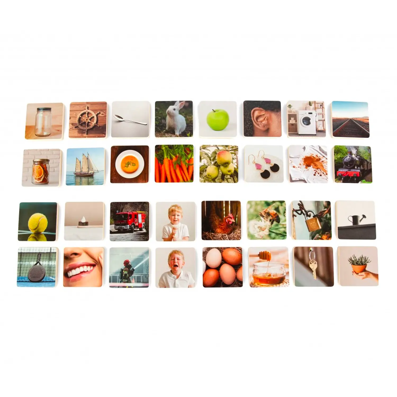 - 32 Tessere con Fotografie Reali: Ogni tessera misura 7x7x1 cm, facile da maneggiare anche dai bambini più piccoli.