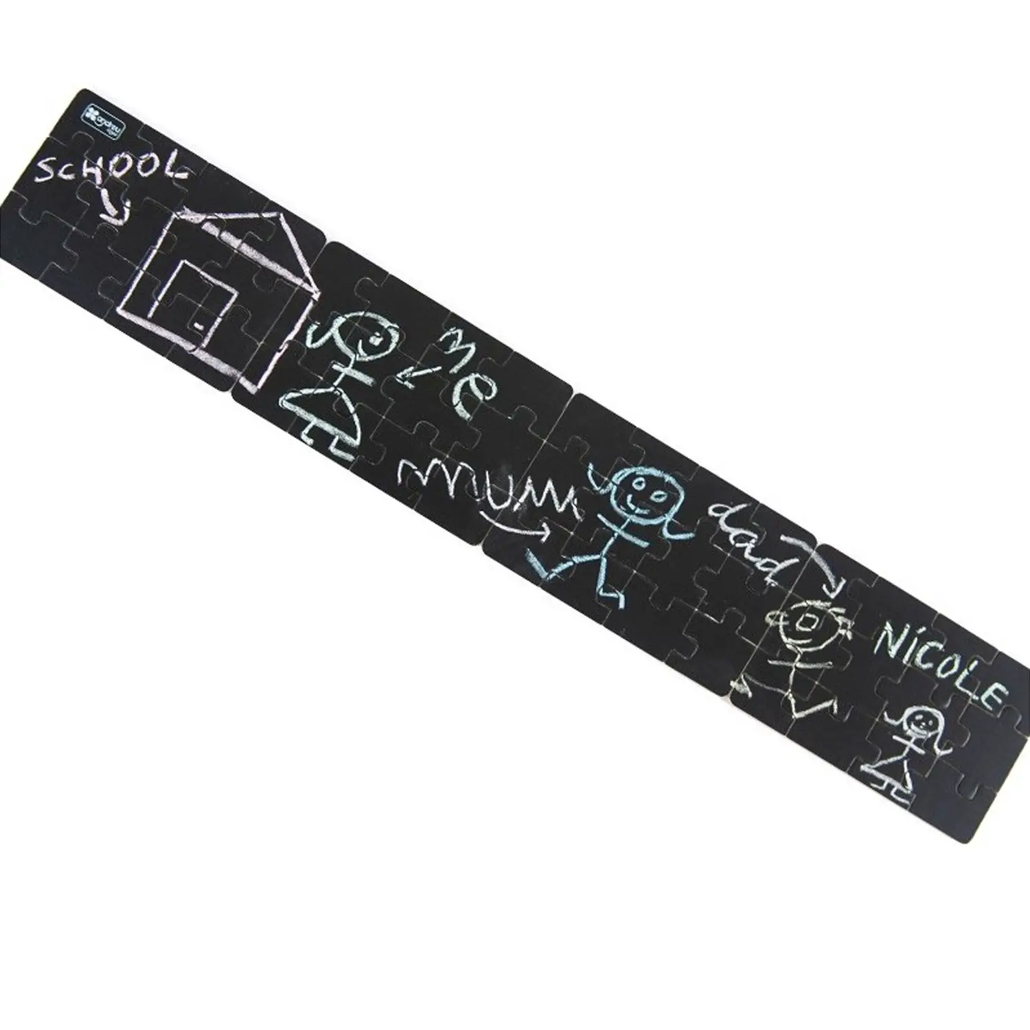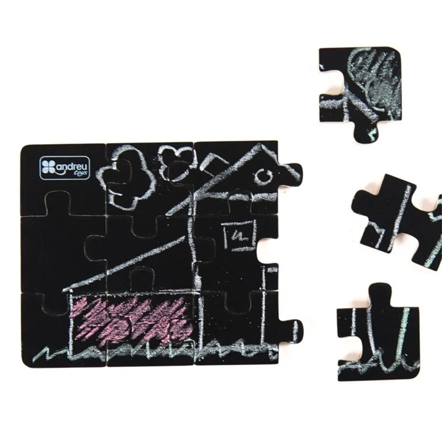 Set creativo composto da 4 puzzle in legno con superficie a lavagna tipo ardesia scrivibile con gessetti. I bambini possono disegnare direttamente sui puzzle con i gessetti colorati inclusi, creare le proprie illustrazioni, smontare e ricomporre ogni puzzle. Perfetto per stimolare la fantasia e la manualità in modo divertente!