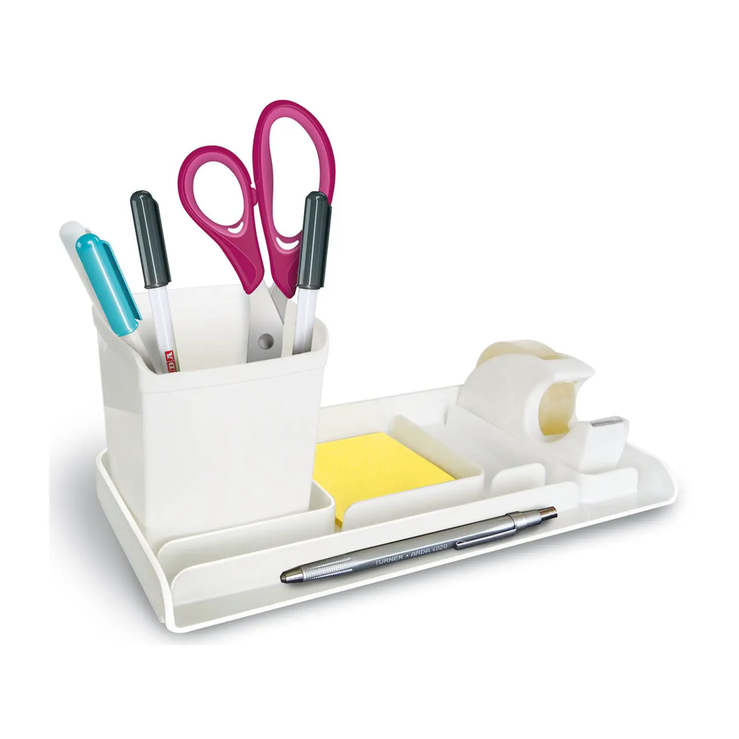 Include portapenne, bacinella portaoggetti e tendinastro a chiocciola, gli accessori essenziali per organizzare penne, post-it, graffette e altri piccoli oggetti.