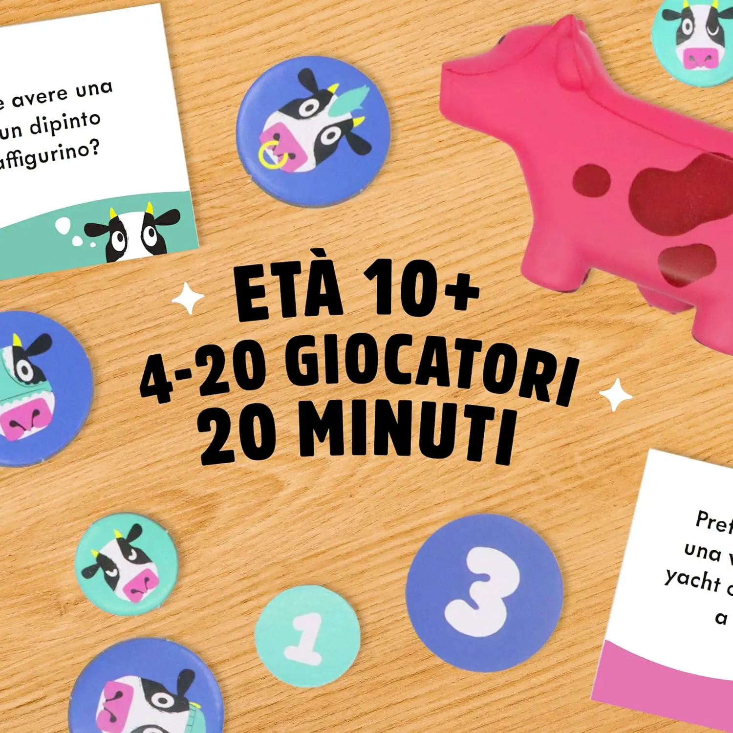 Attenzione alla Mucca Rosa! Se un giocatore è l’unico a dare una risposta diversa da tutti gli altri, riceve la famosa Mucca Rosa. Questo speciale segnalino blocca il punteggio finché non si riesce a liberarsene, rendendo il gioco ancora più imprevedibile.