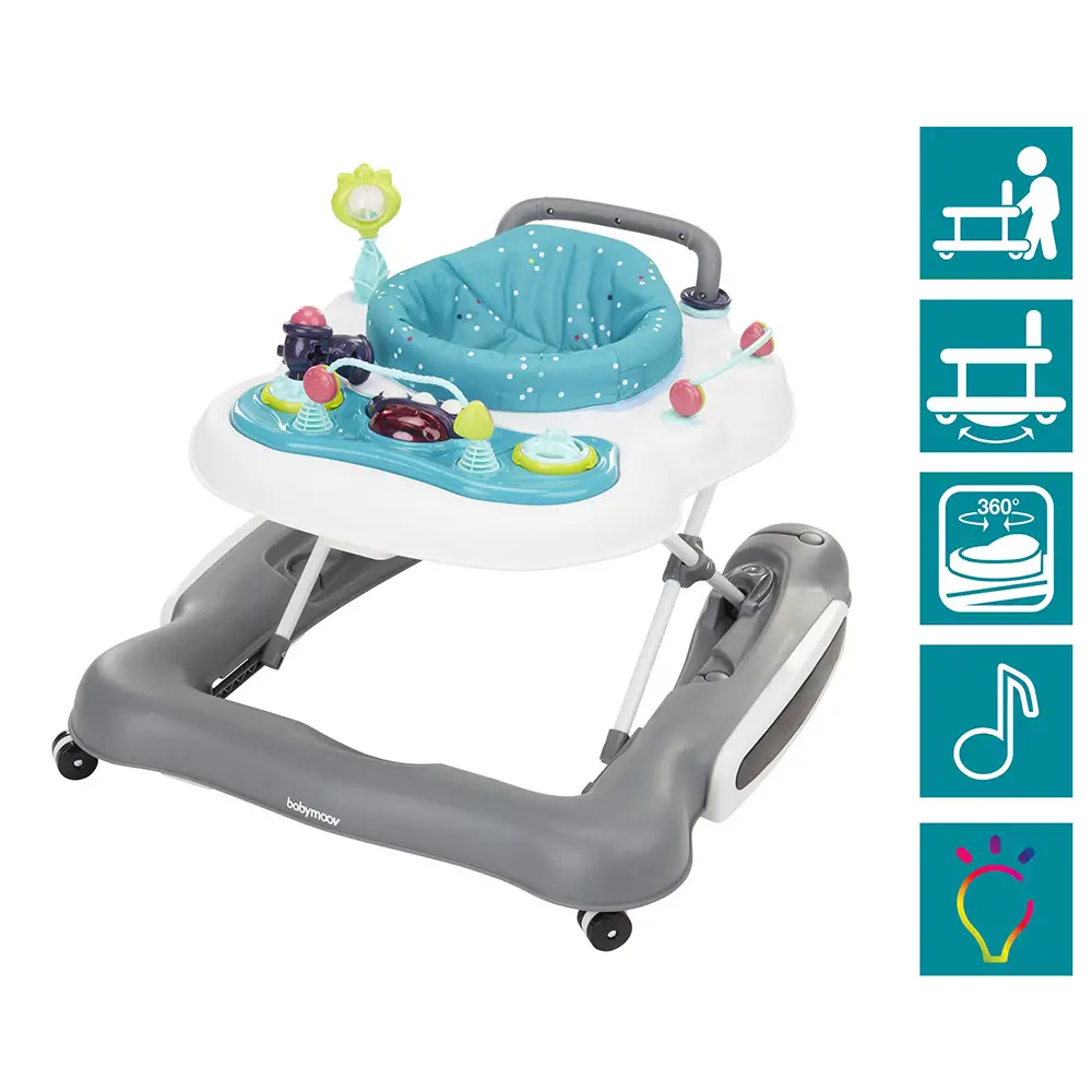Il Girello 5 in 1 Verde Acqua Babymoov è la soluzione ideale per i genitori che cercano un girello evolutivo, sicuro e multifunzione, capace di unire gioco, sviluppo motorio e comfort.