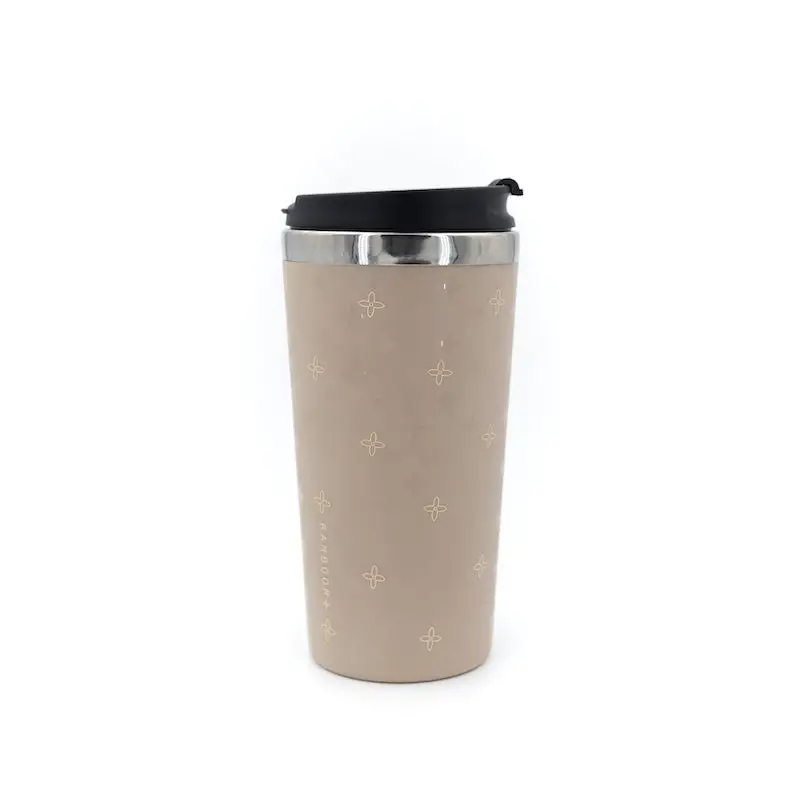 Grazioso e pratico Termos per neonato, per bimbo o per la mamma! Realizzato in materiale certificato, 100% organico e sostenibile. Di curato design, resistente e sicuro, con delicati loghi in color cammello! Un perfetto regalo per una mamma alla moda!