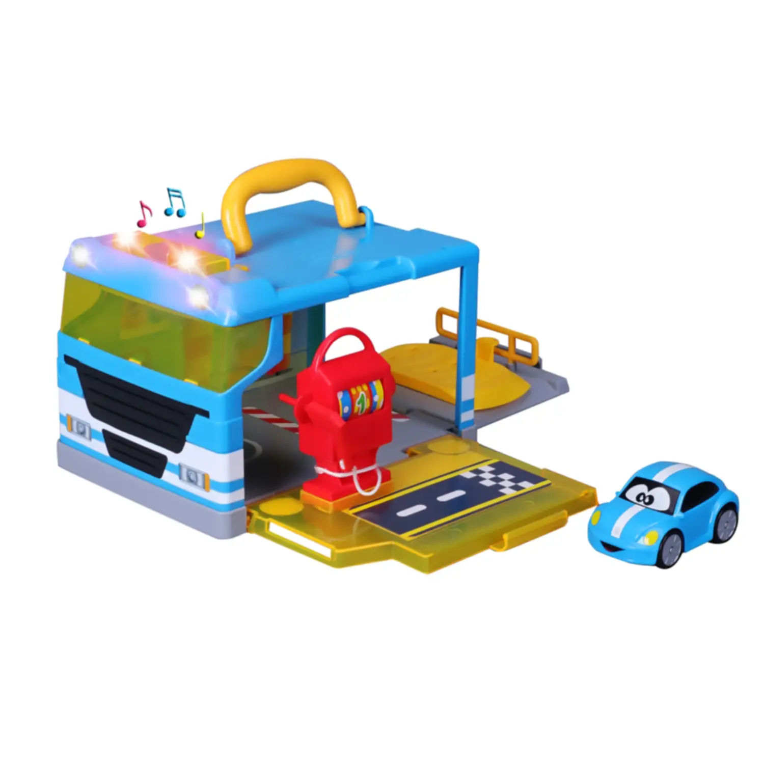 - ✅ Disponibile in due varianti: garage blu con auto blu oppure garage rosso con auto gialla.