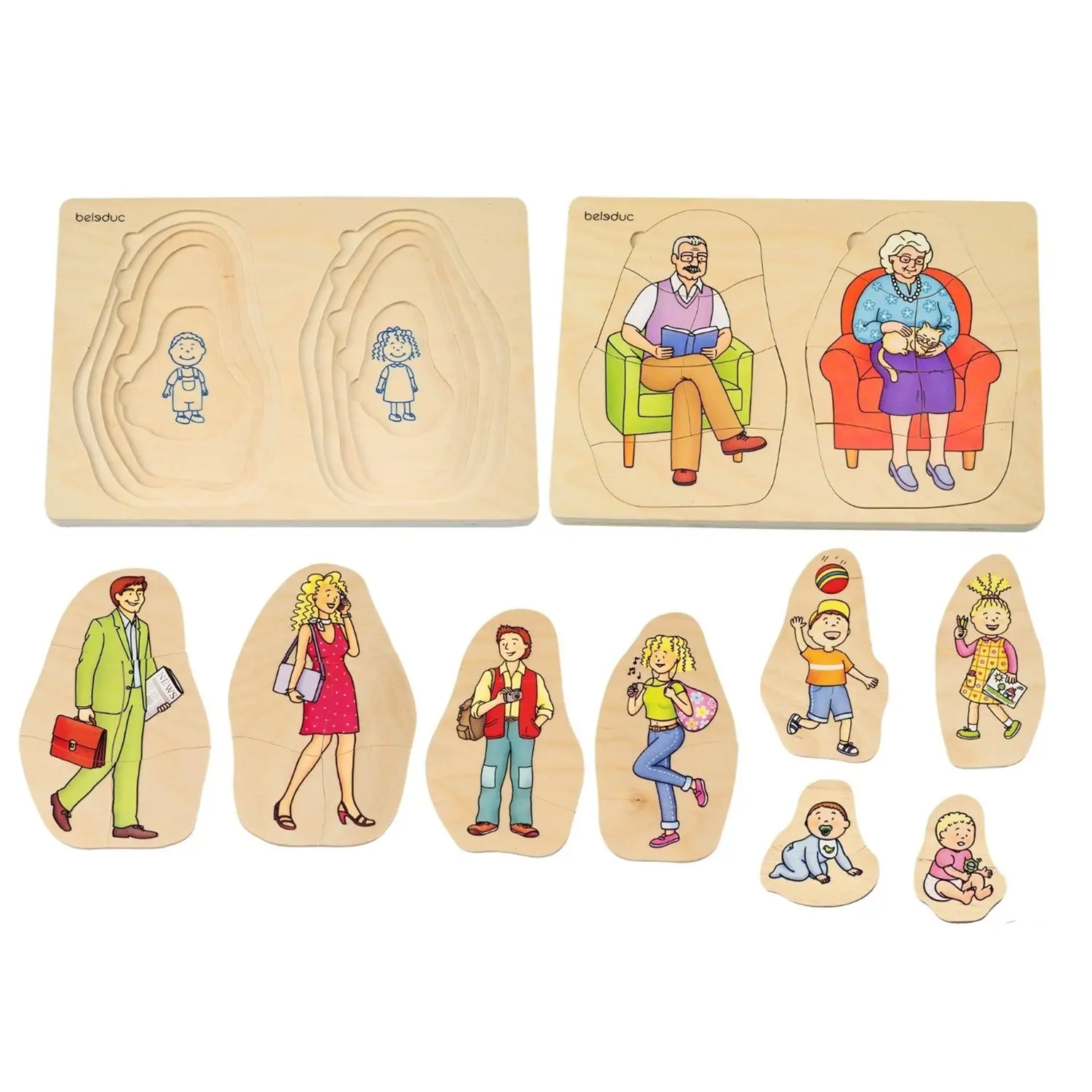 - Puzzle Multistrato: Composto da un vassoio in legno con cinque scenari sovrapponibili, ciascuno rappresentante una fase diversa della vita.