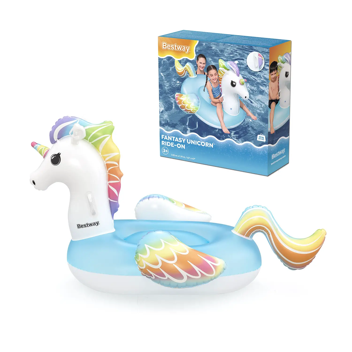 Il Cavalcabile Unicorno Fantasy con dimensioni di 1,55 m x 1,19 m è il compagno ideale per le avventure in acqua dei bambini dai 3 anni in su. Con una capacità di peso di 45 kg, è perfetto per offrire ore di divertimento magico sotto il sole.