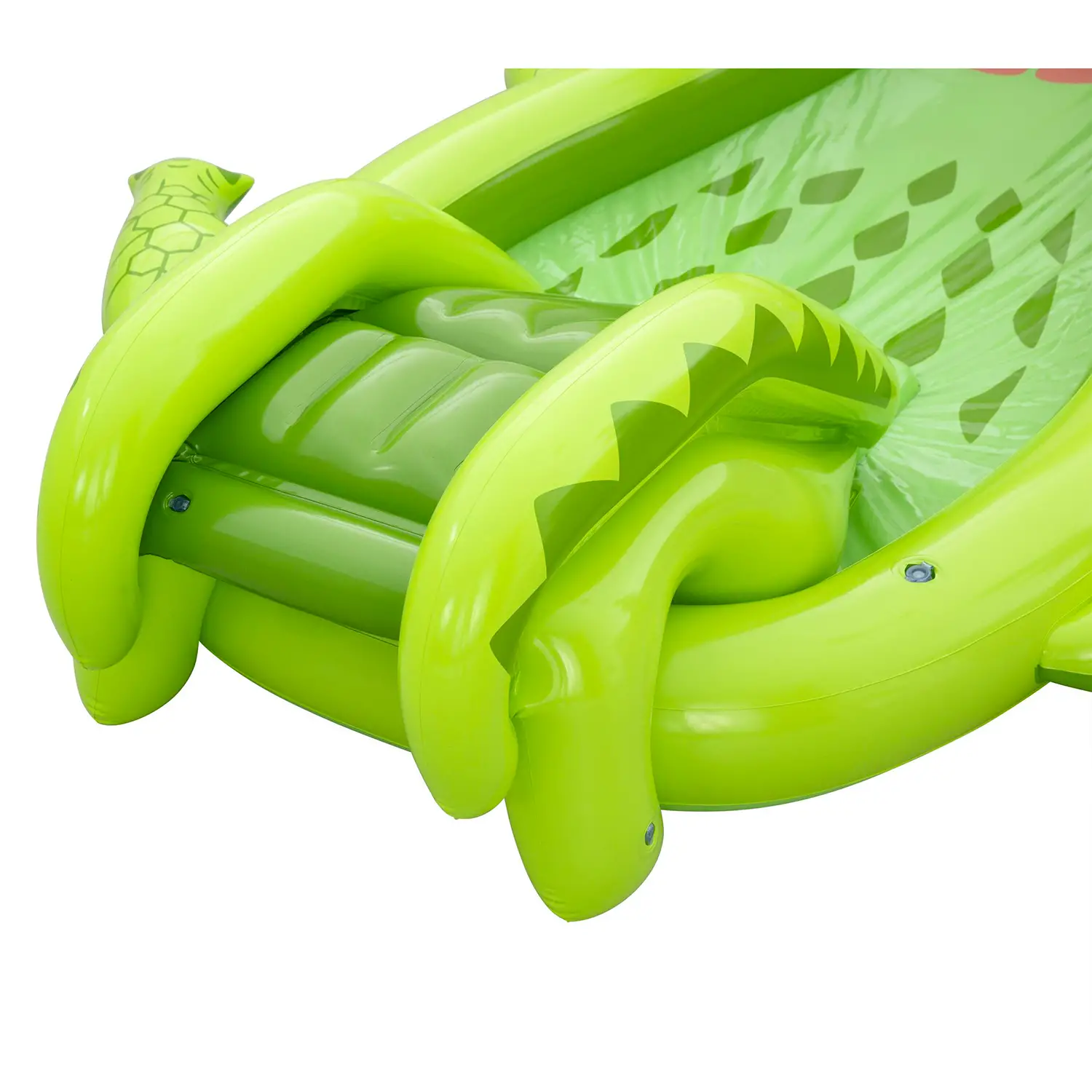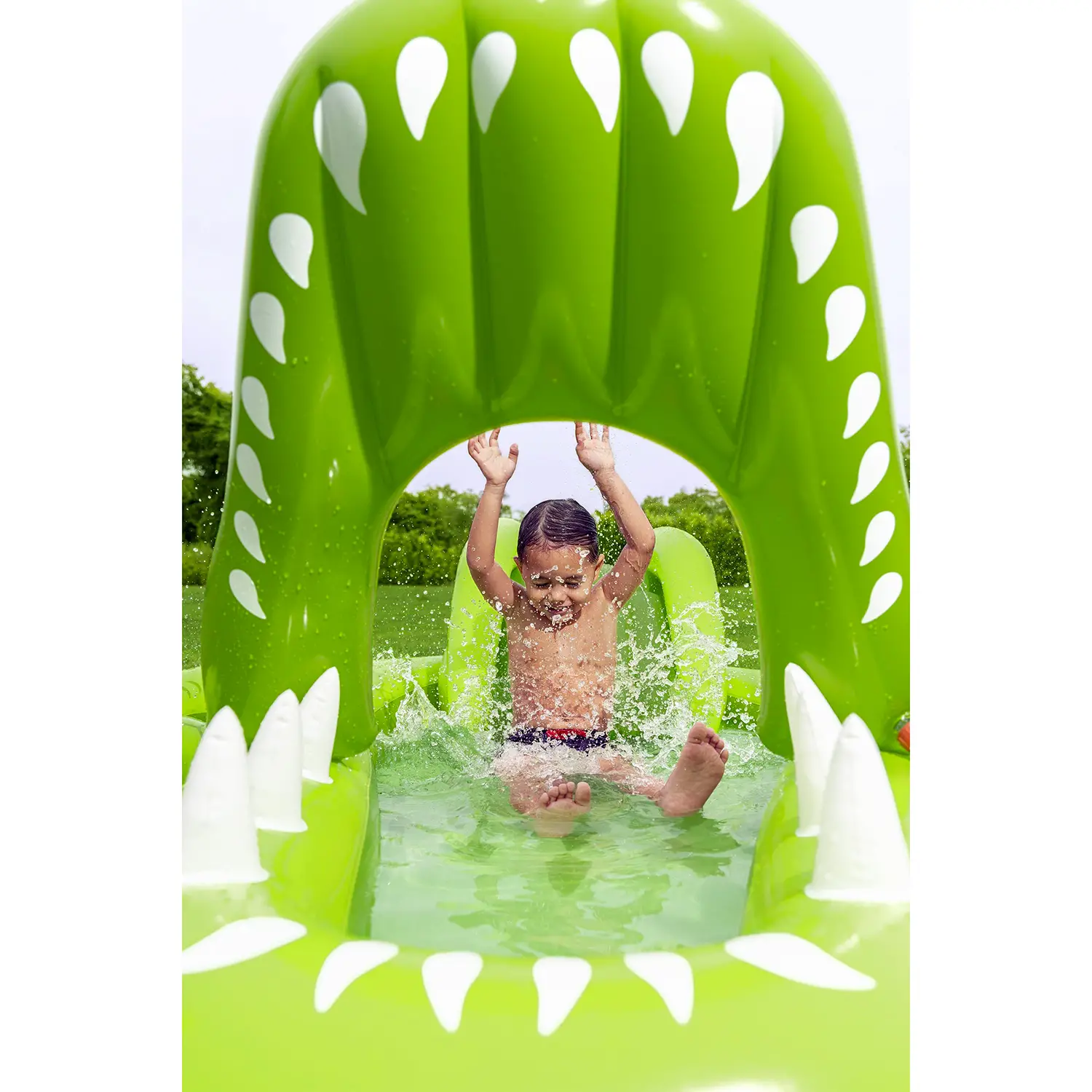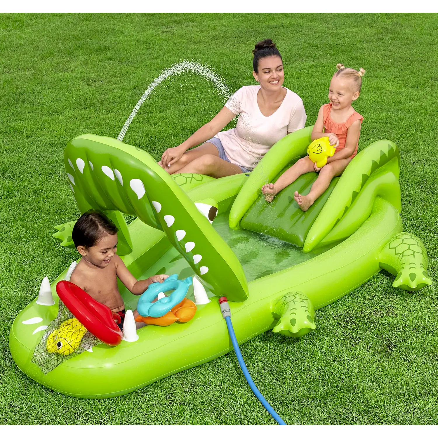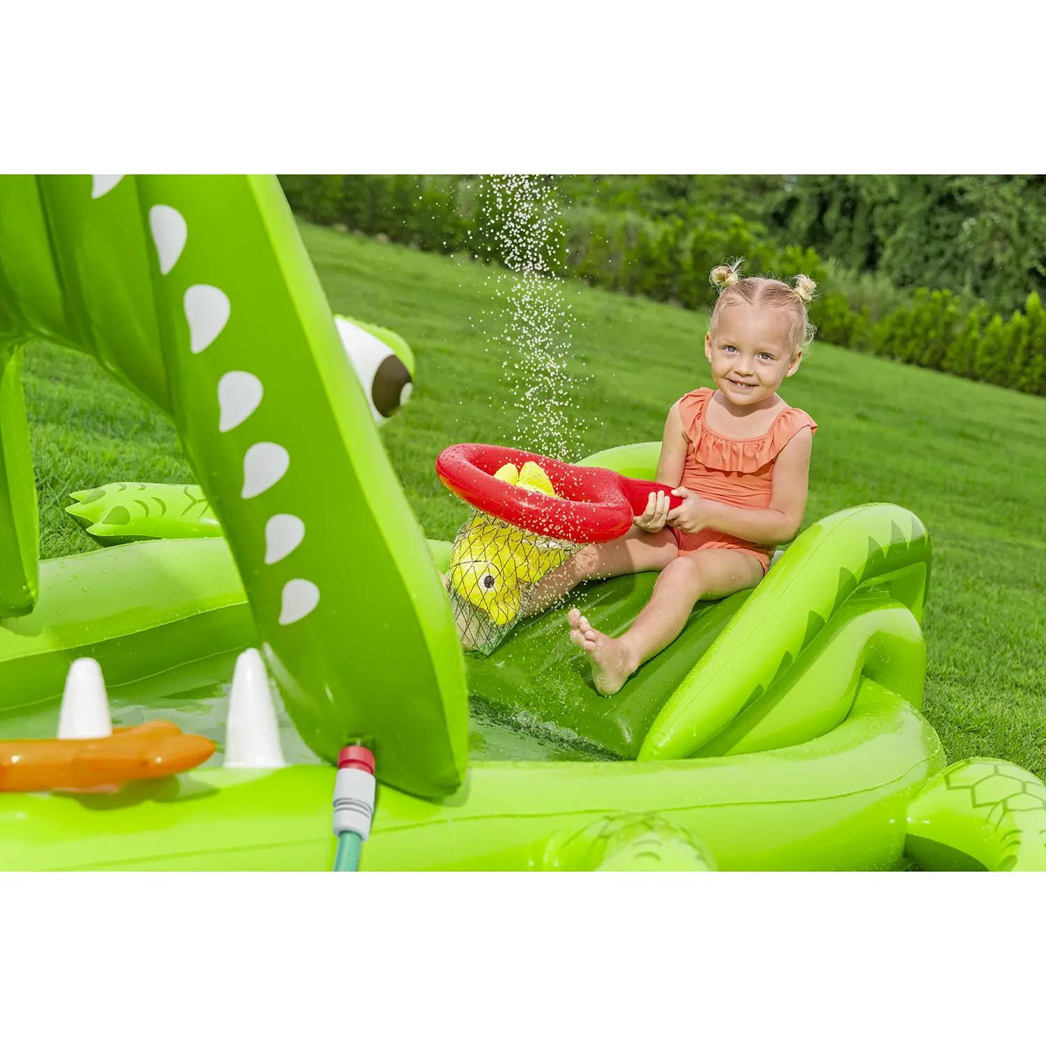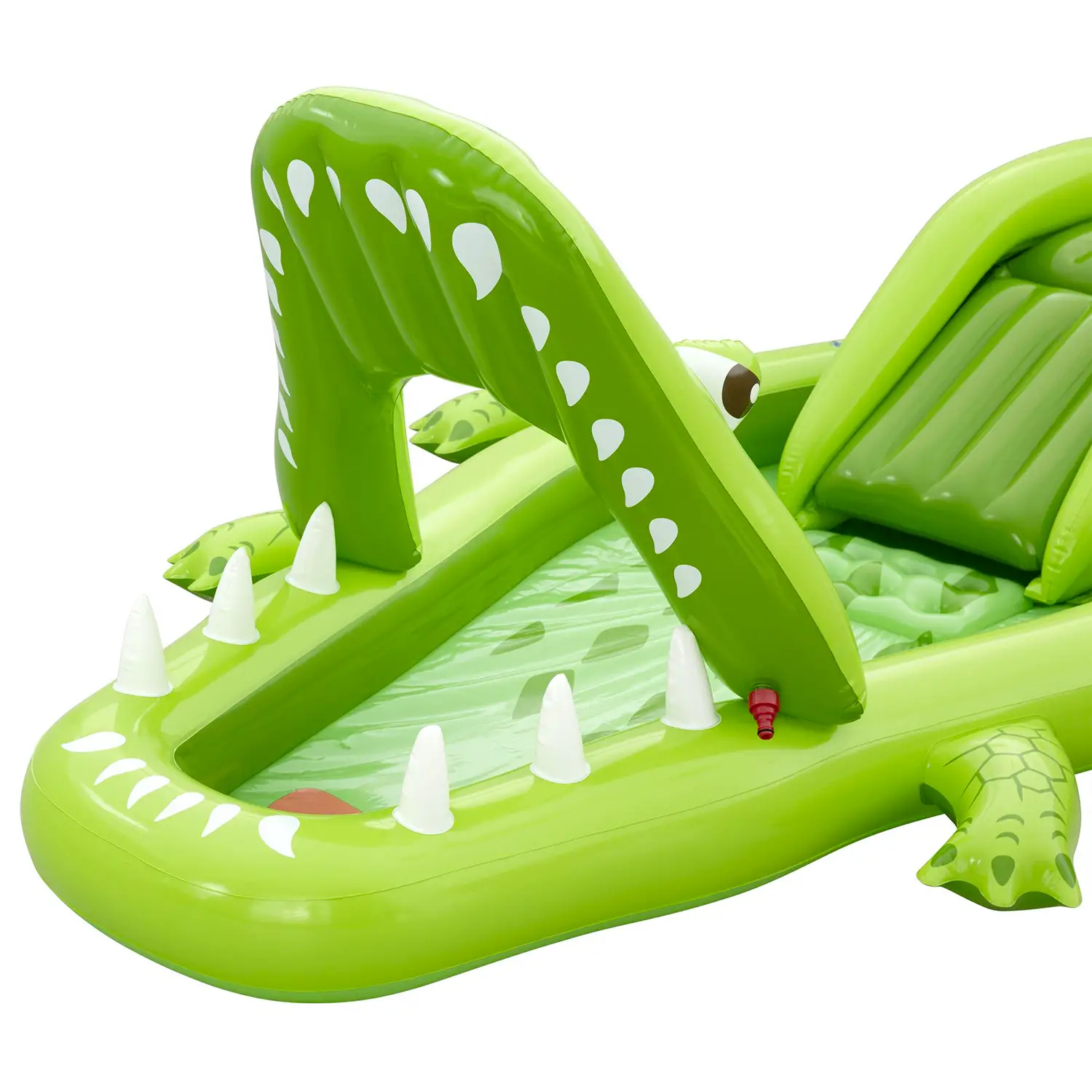 Design a coccodrillo interattivo Il simpatico design a forma di coccodrillo stimola fantasia e gioco creativo. La bocca dell’alligatore integra un irrigatore collegabile alla manichetta, che spruzza acqua verso lo scivolo per un divertimento ancora più dinamico.