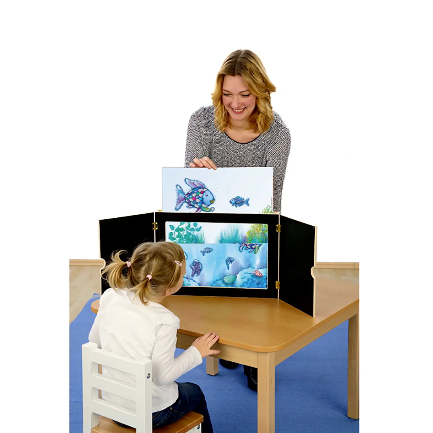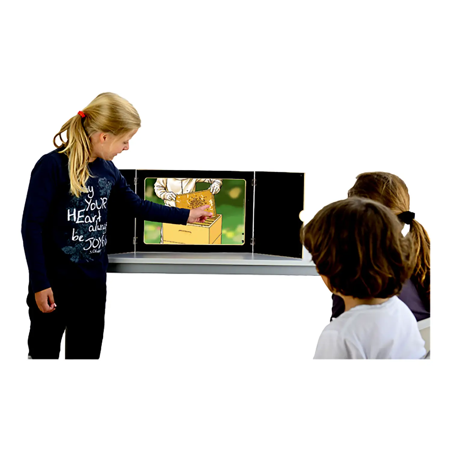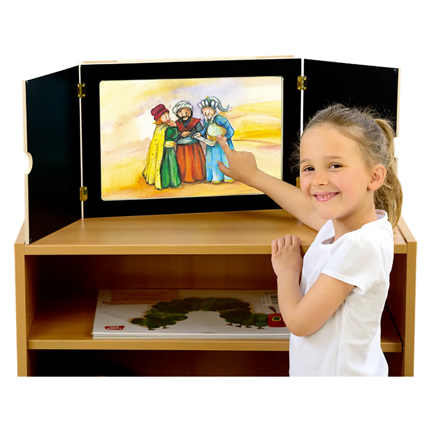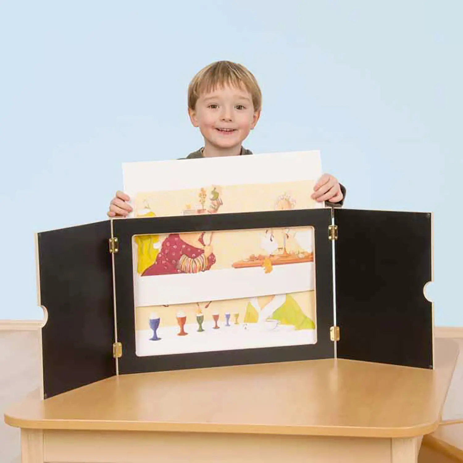 Struttura Solida e Sicura Realizzato in legno robusto con cerniere sicure per bambini, presenta interno nero per valorizzare le immagini e finitura naturale esterna. Facile inserimento delle tavole dall’alto.