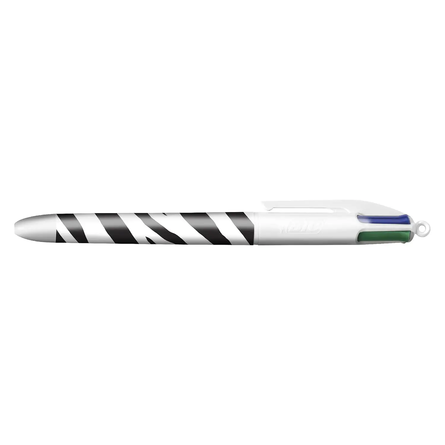 Design Animalier Originale - Questa confezione di penne BIC 4 Colori propone fantasie esotiche ispirate al mondo animale: zebra, leopardo e tigre per uno stile audace e divertente.