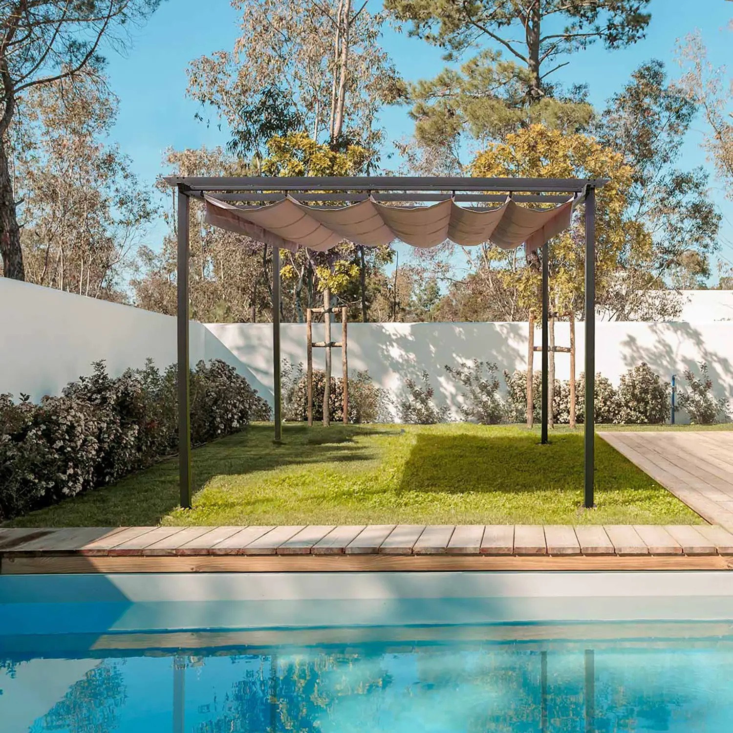 Scorrevole sui binari: Il gazebo è dotato di un sistema scorrevole sui binari, che consente di aprire e chiudere facilmente il telo in base alle esigenze. Questo ti permette di regolare l’ombra e la protezione desiderate.