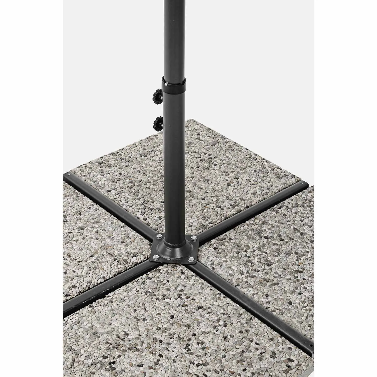 Base a croce: L’ombrellone include una base a croce in acciaio, che fornisce stabilità alla struttura. Le piastrelle per la base non sono incluse, ma possono essere aggiunte per ancorare l’ombrellone al terreno in modo sicuro.
