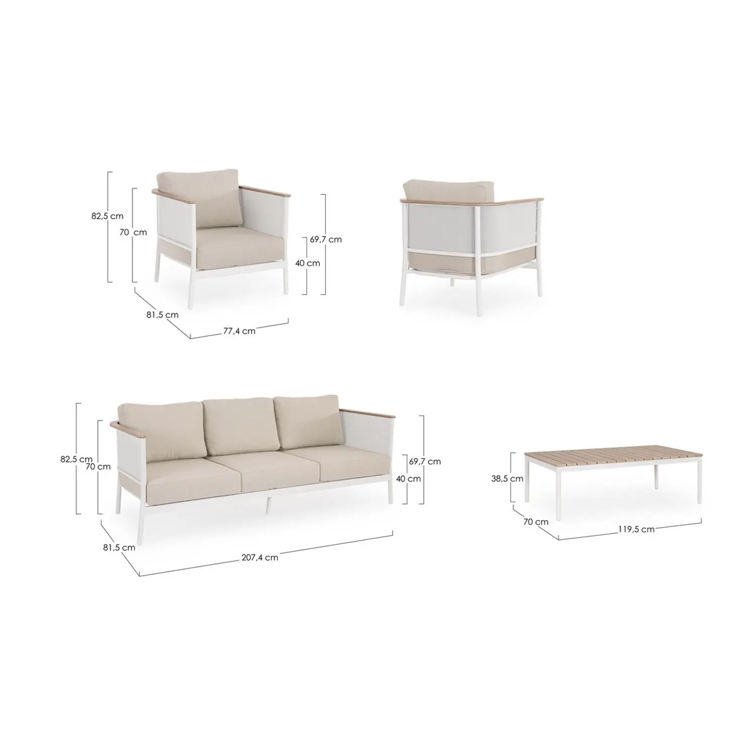 Struttura solida e durevole – Realizzata in alluminio verniciato a polvere (poliestere), resistente agli agenti atmosferici per una lunga durata. Effetto legno naturale – Braccioli e piano tavolino in alluminio verniciato effetto legno, un perfetto mix tra estetica e resistenza. Cuscini idrorepellenti e sfoderabili – Seduta e schienale dotati di cuscini in tessuto Olefin (100% polipropilene), resistenti all’acqua, alle macchie e ai raggi UV. Tavolino funzionale – Perfetto per appoggiare bevande, libri o decorazioni, con gambe in alluminio e viteria in acciaio inox, facile da montare.
