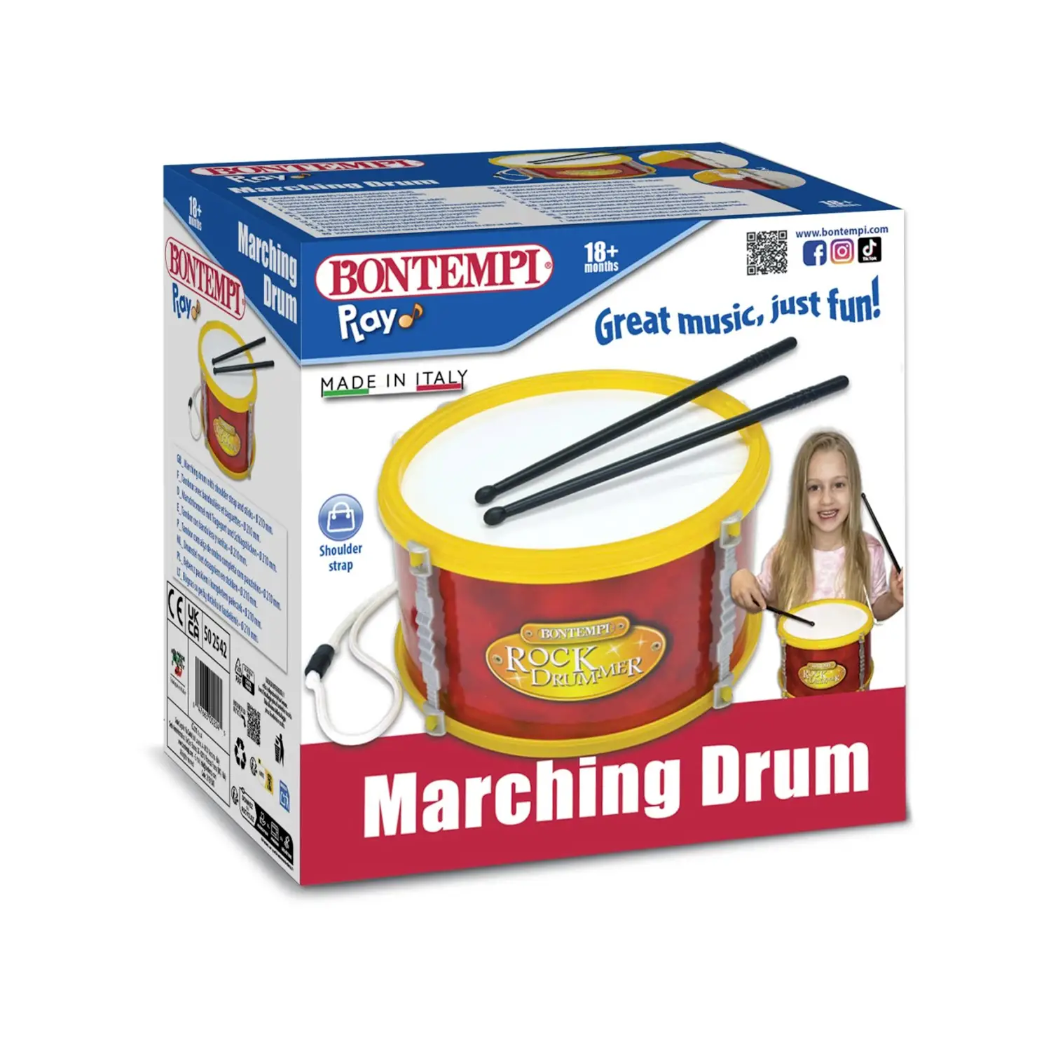 Il primo tamburo per piccoli musicisti Il tamburo Bontempi con tracolla è perfetto per avvicinare i bambini al ritmo e alla musica in modo divertente e coinvolgente.
