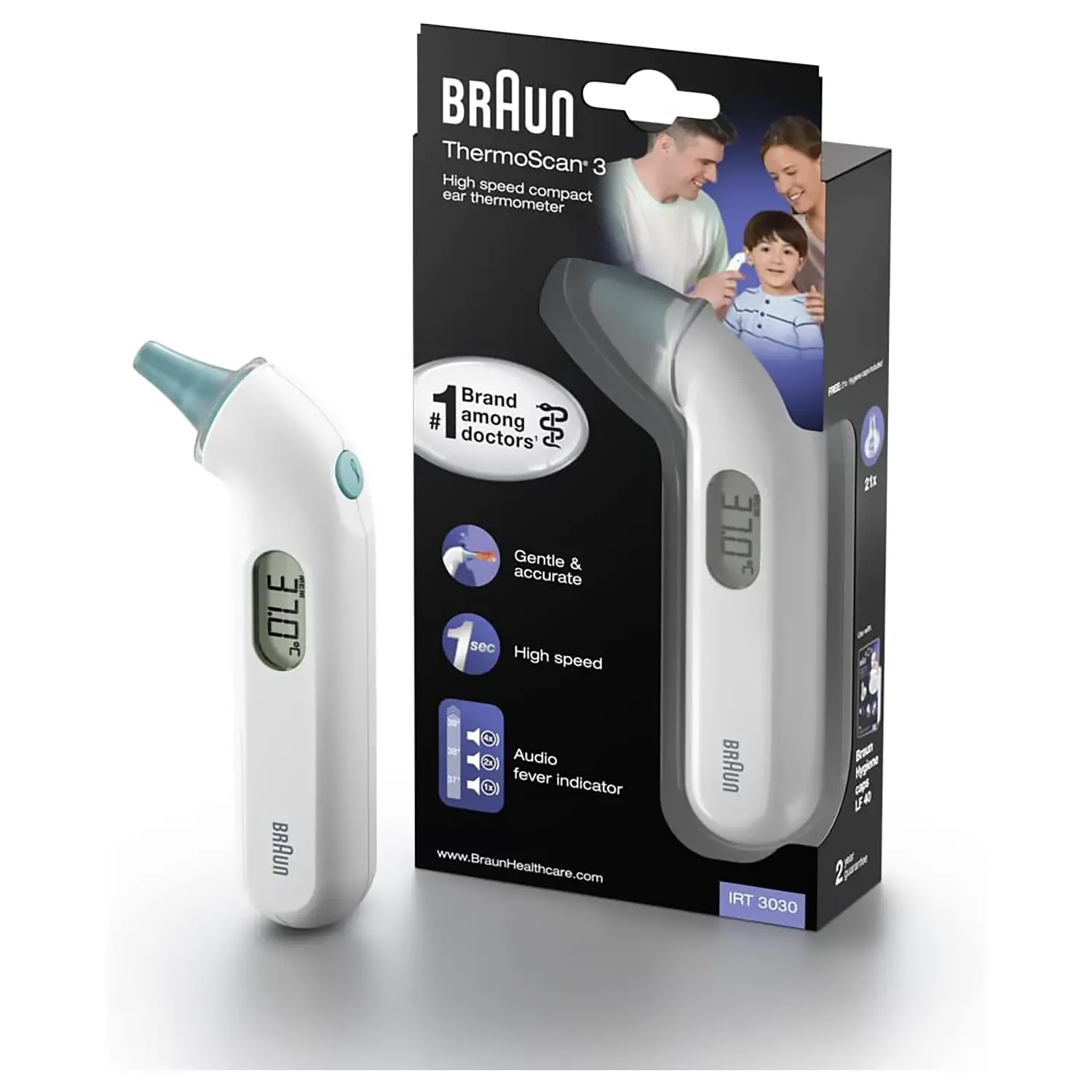 Braun ThermoScan 3: Termometro Auricolare Veloce e Affidabile - Braun ThermoScan 3 è il termometro auricolare compatto e facile da usare. Misura la temperatura in soli un secondo, rendendolo uno strumento essenziale per la tua famiglia.