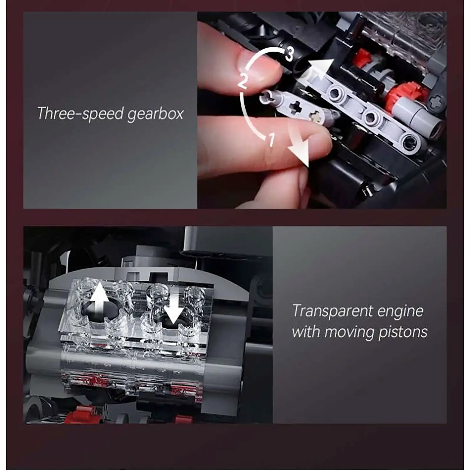 Meccanismo motore trasparente - Ammira il motore a vista collegato alla ruota posteriore: replica perfetta della trasmissione meccanica per un effetto didattico.