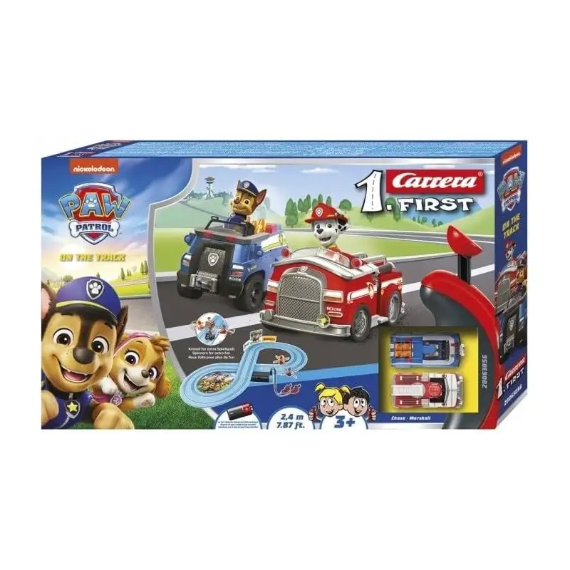 Chase e Marshall corrono sulla tua pista personale Il set Carrera FIRST PAW Patrol – On The Track include i celebri Chase e Marshall, pronti a sfidarsi su una pista lunga 2,4 metri piena di curve, rettilinei e una rotatoria divertente.