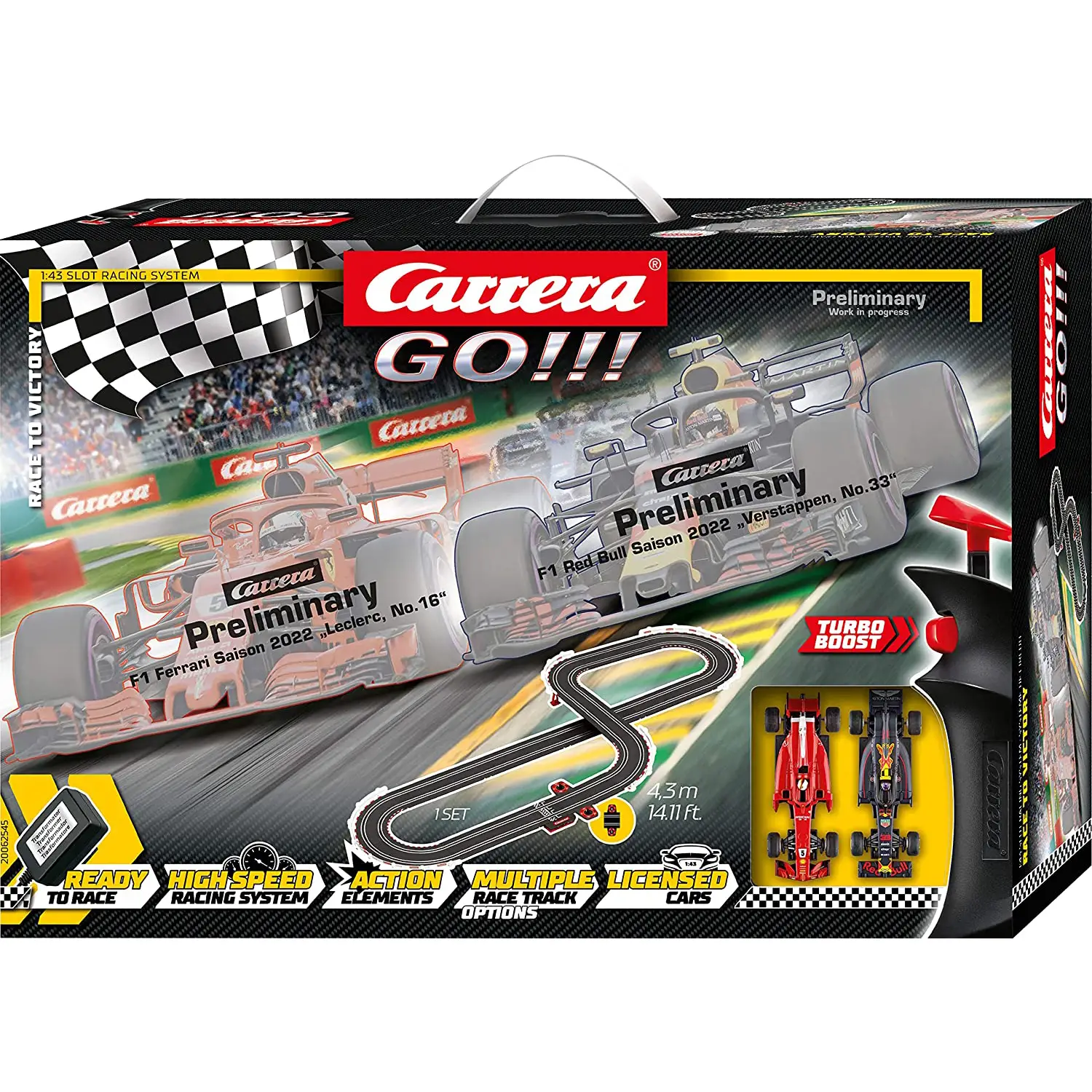 Porta l’emozione della Formula 1 a casa con la Carrera GO!!! Race To Victory, un circuito lungo 4,3 metri con rettilinei, curve, ponti e sorpassi mozzafiato. Perfetto per bambini dai 6 anni in su, include le iconiche vetture Ferrari F1-75 e Red Bull Racing RB18, pronte per gare emozionanti!