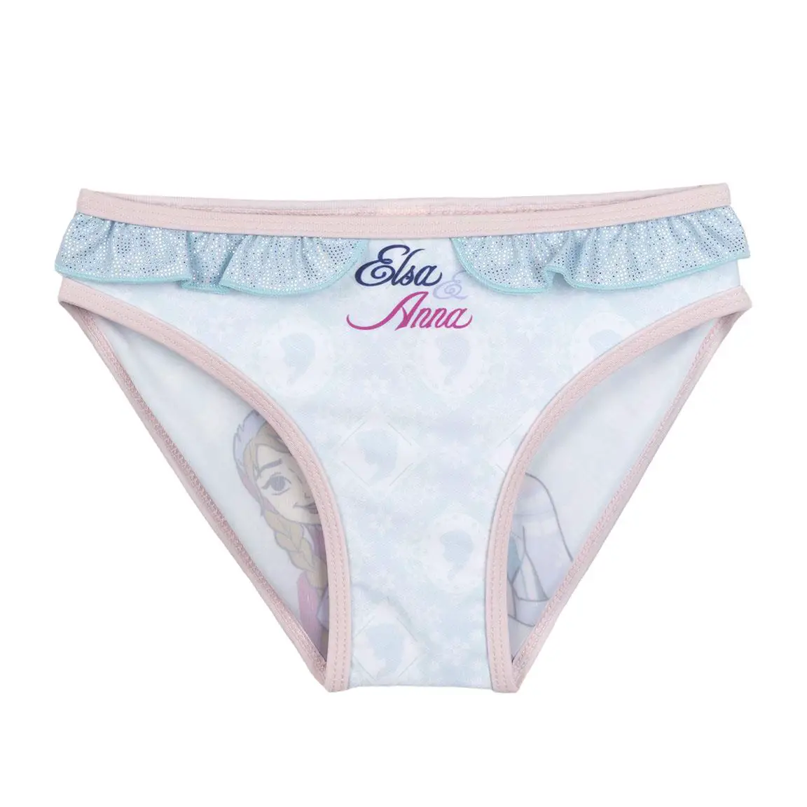 Questo costume Slip Frozen è decorato con i personaggi amati di Elsa e Anna, con un design colorato che riporta le icone del film, come fiocchi di neve e ghiaccio. Il tutto in una versione allegra e vivace.
