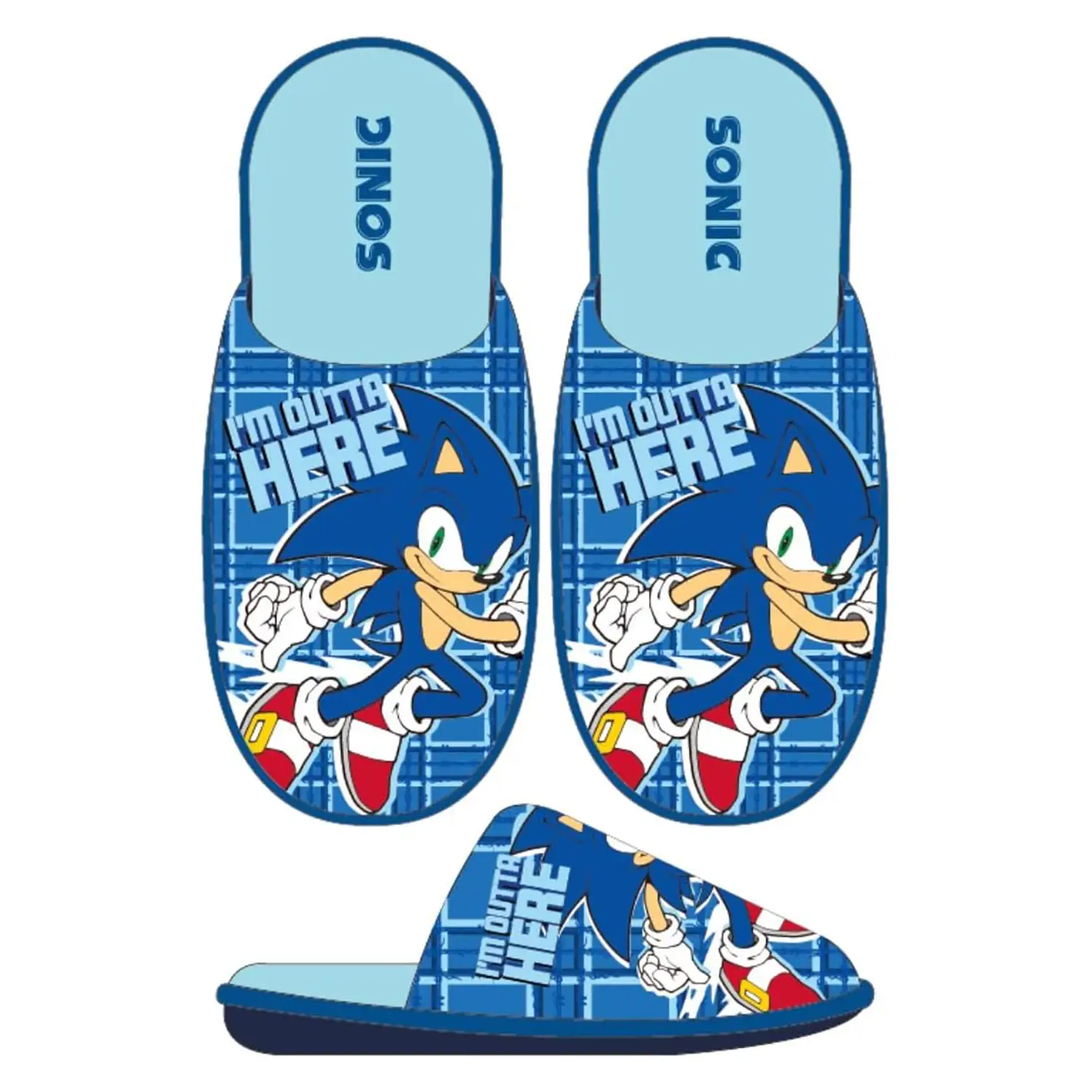 Design: Con il personaggio di Sonic in posizione dinamica e la frase “I’m outta here”, queste pantofole hanno un design accattivante e colorato.