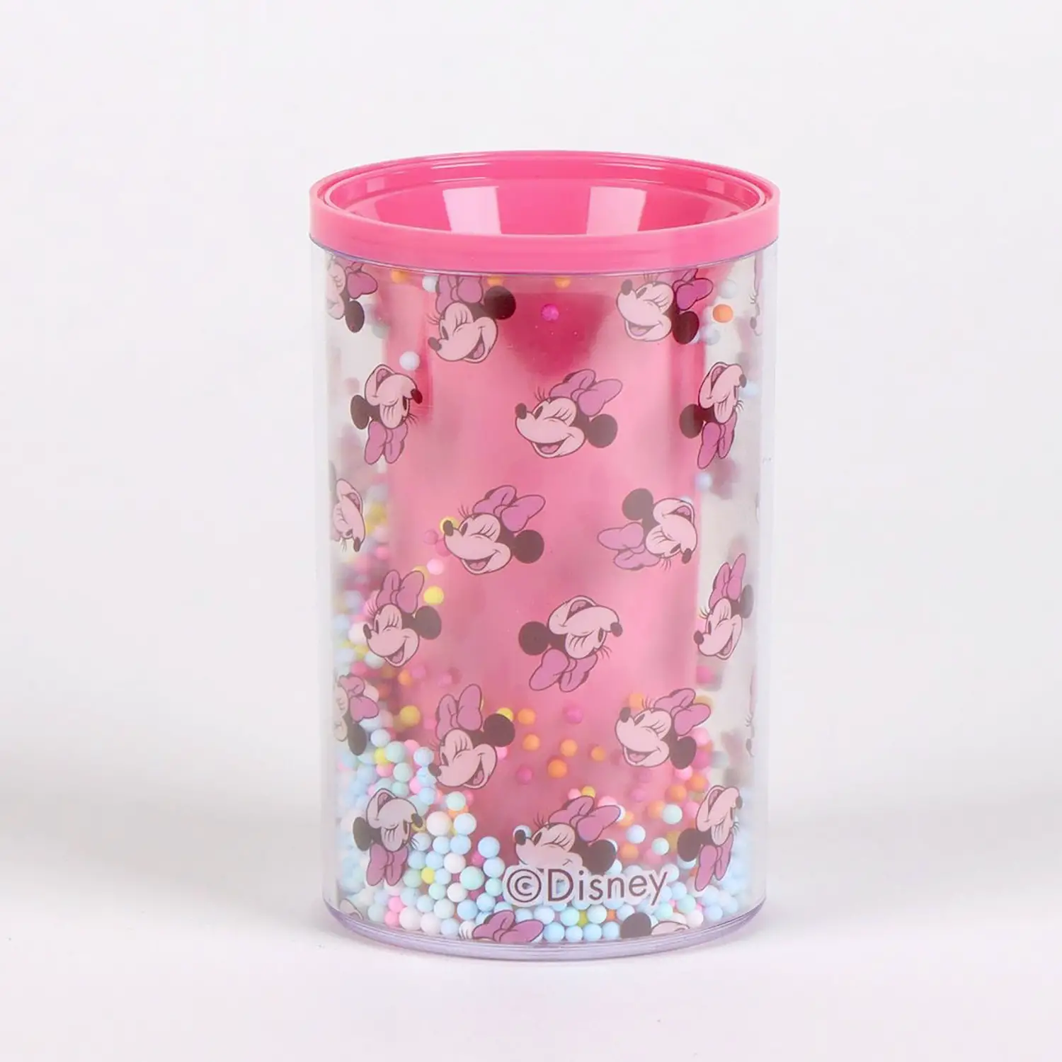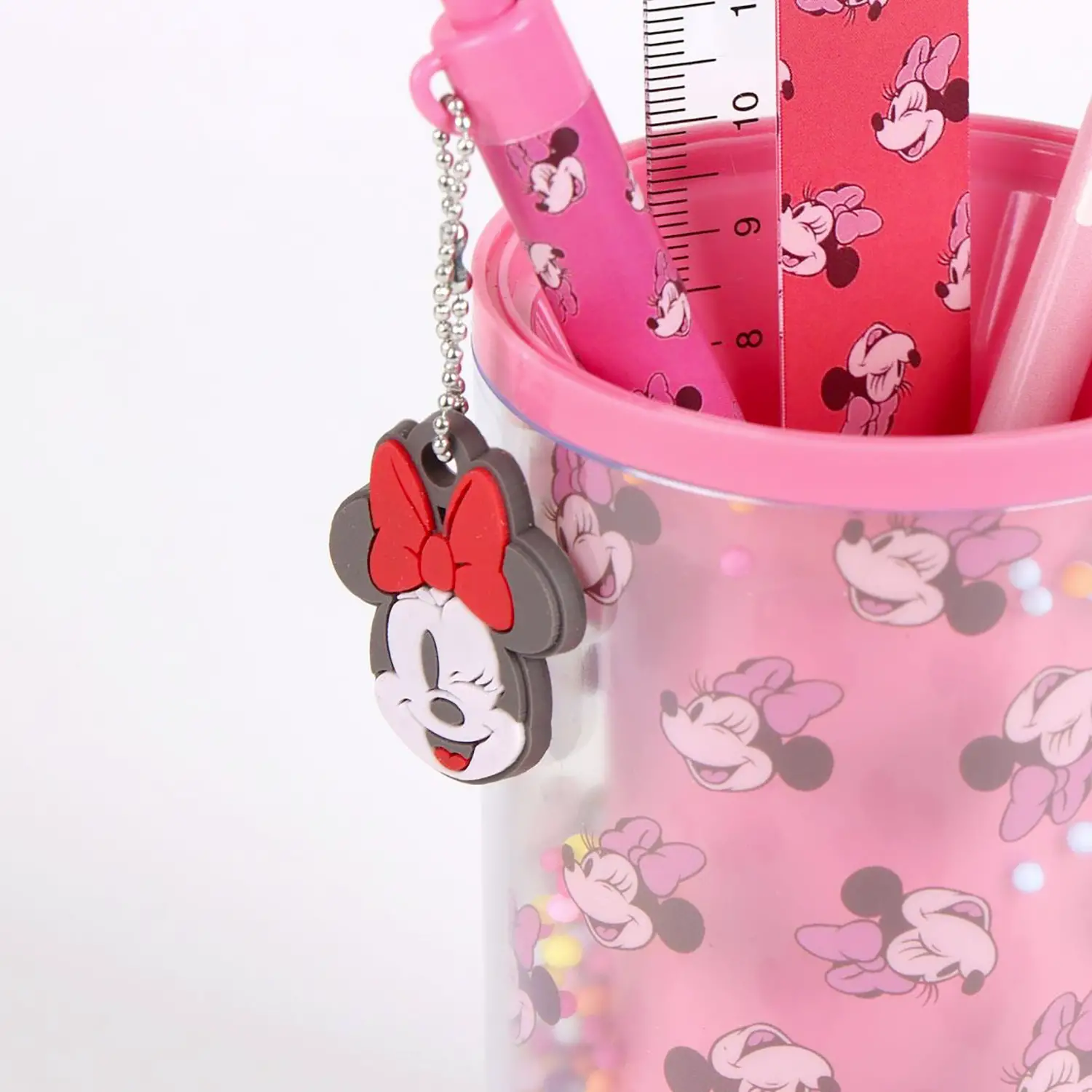 Design Rosa e Super Glamour Il portapenne trasparente è decorato con stampe di Minnie e dettagli scintillanti, per aggiungere un tocco di allegria e stile a qualsiasi scrivania.