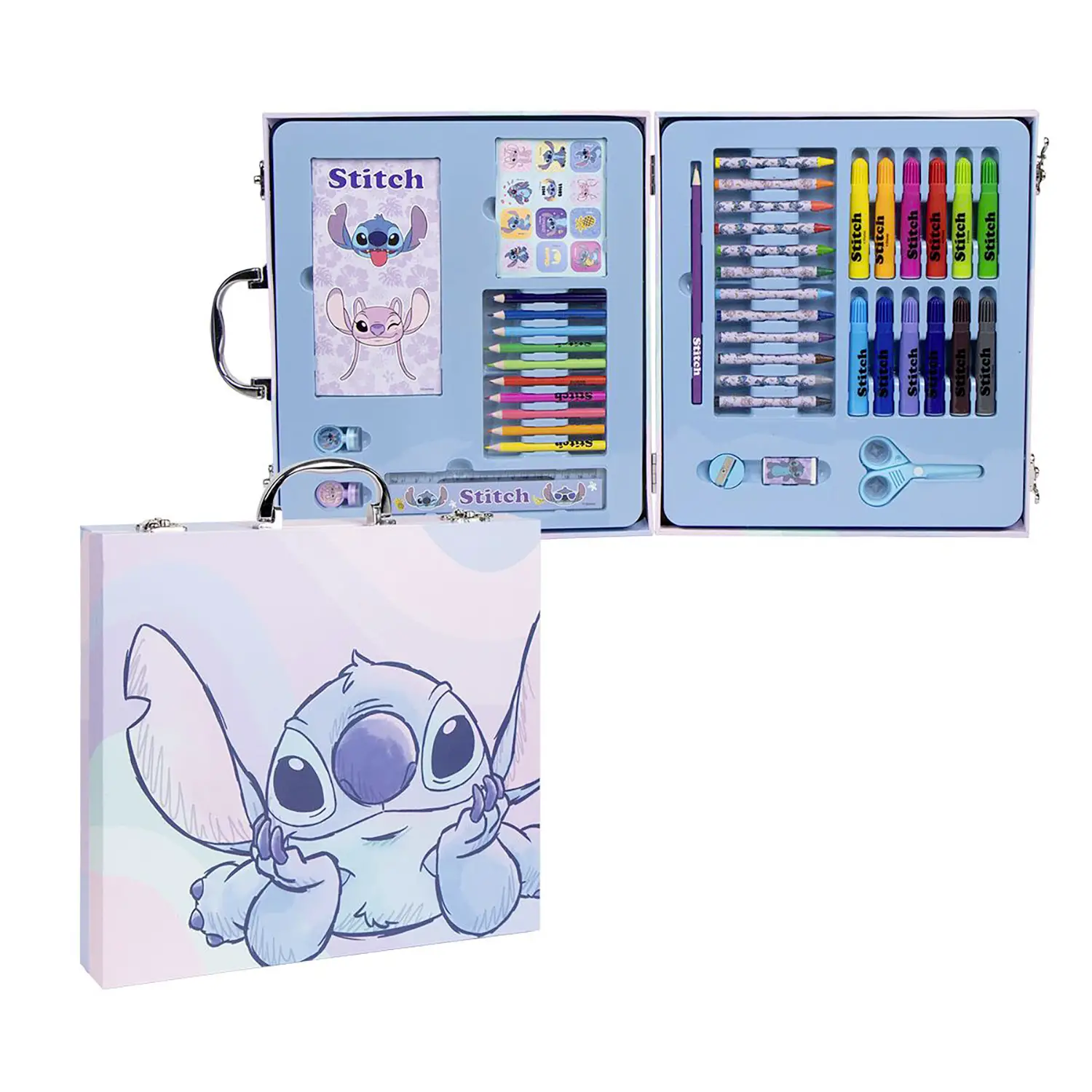 Licenza Ufficiale Disney Immergiti nel mondo magico di Stitch e Lilo con questo set di cancelleria ufficiale Disney! Perfetto per tutti i piccoli artisti che vogliono colorare e creare con il loro personaggio preferito. Valigetta Completa per la Creatività Questo fantastico set include tutto il necessario per disegnare e personalizzare i propri capolavori: 12 matite colorate 12 colori a cera 10 pennarelli 2 stampini 1 gomma da cancellare 1 temperamatite 1 righello 1 forbice 1 quadernino Adesivi decorativi