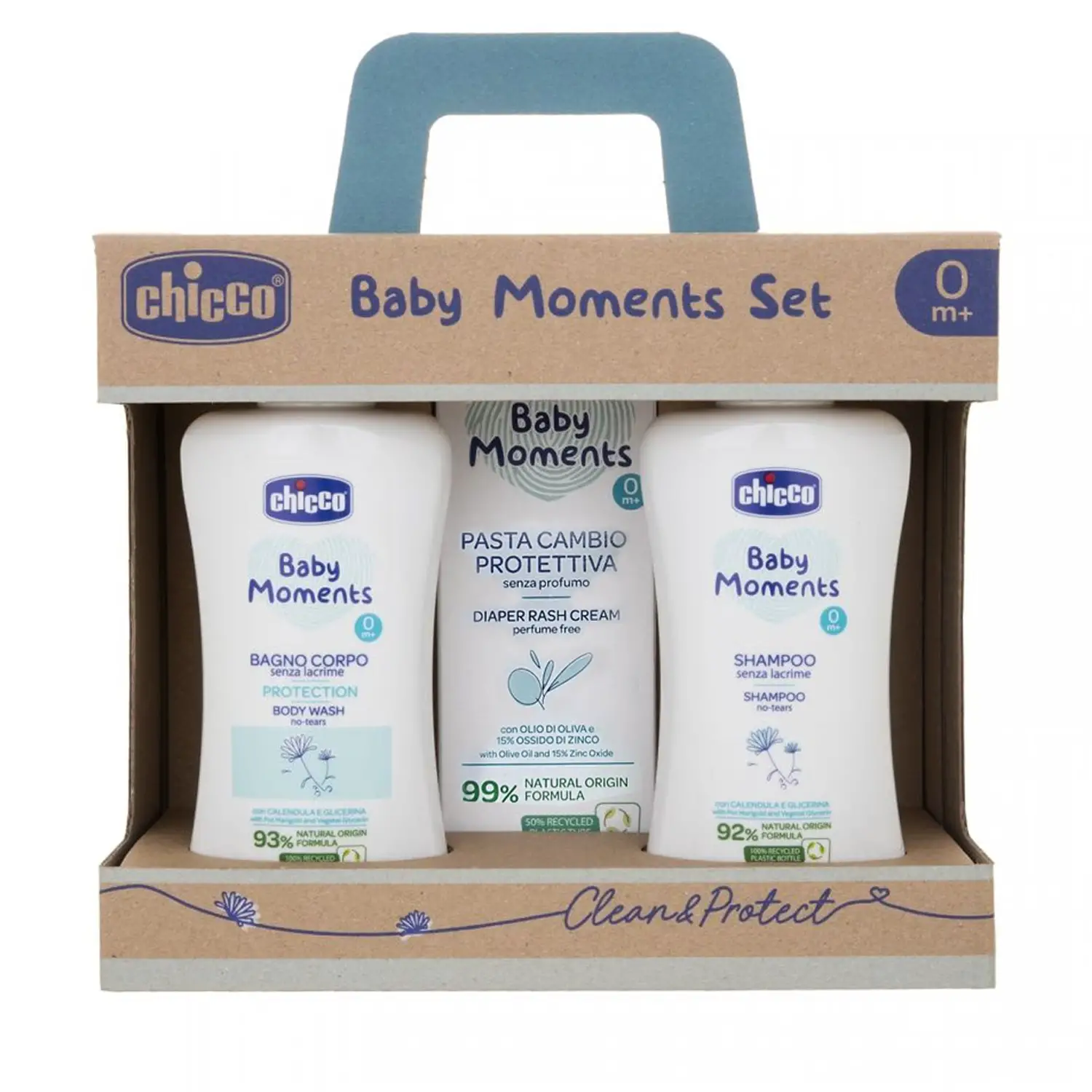 - ✅ Set Chicco con bagno corpo 200 ml, shampoo 200 ml e pasta cambio protettiva 100 ml.