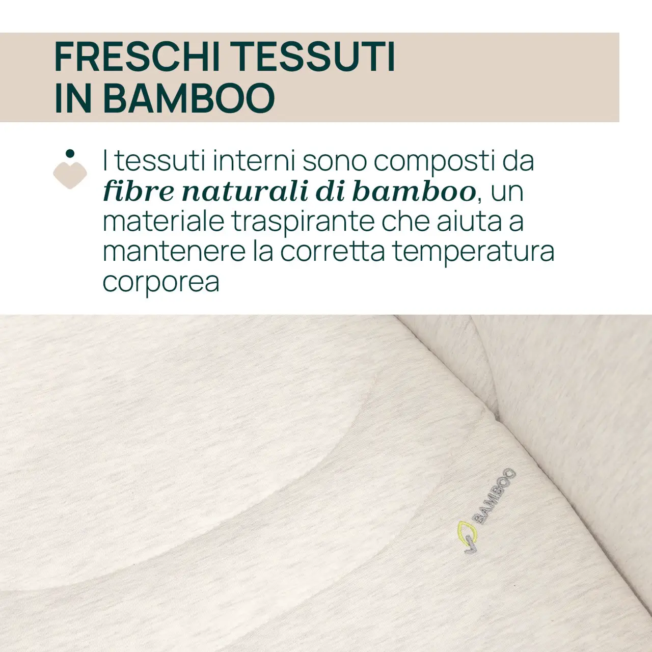 Tessuti in Bambù Naturale Traspirante Gli interni sono realizzati in fibre naturali di bambù, perfette per la pelle delicata del neonato. Il bambù favorisce la traspirazione e aiuta a mantenere la temperatura corporea ideale, creando un nido morbido e accogliente.