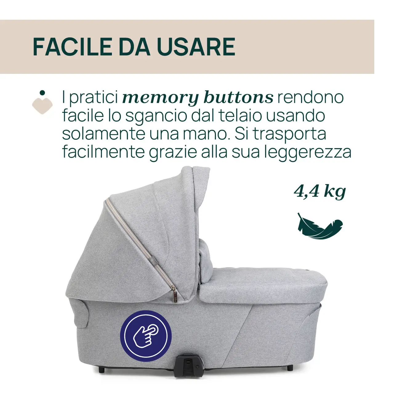 Utilizzo Intuitivo con Memory Buttons La culla si sgancia dal telaio del passeggino con una sola mano grazie ai pratici memory buttons. Una soluzione pensata per facilitare la vita dei genitori, rendendo ogni spostamento rapido e senza sforzo.