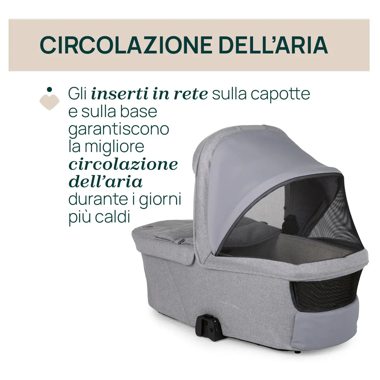 Comfort Climatico Tutto l’Anno Gli inserti in rete su capote e base della navicella assicurano una circolazione dell’aria ottimale nei giorni caldi. Nei mesi invernali, l’aletta antivento estraibile sulla copertina protegge il bambino da freddo e correnti.
