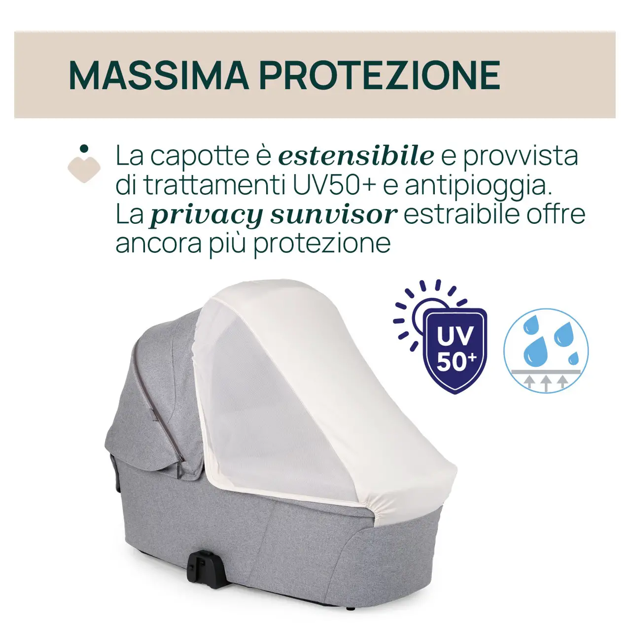 - ✅ • Capote estensibile con protezione UV50+ e trattamento idrorepellente.