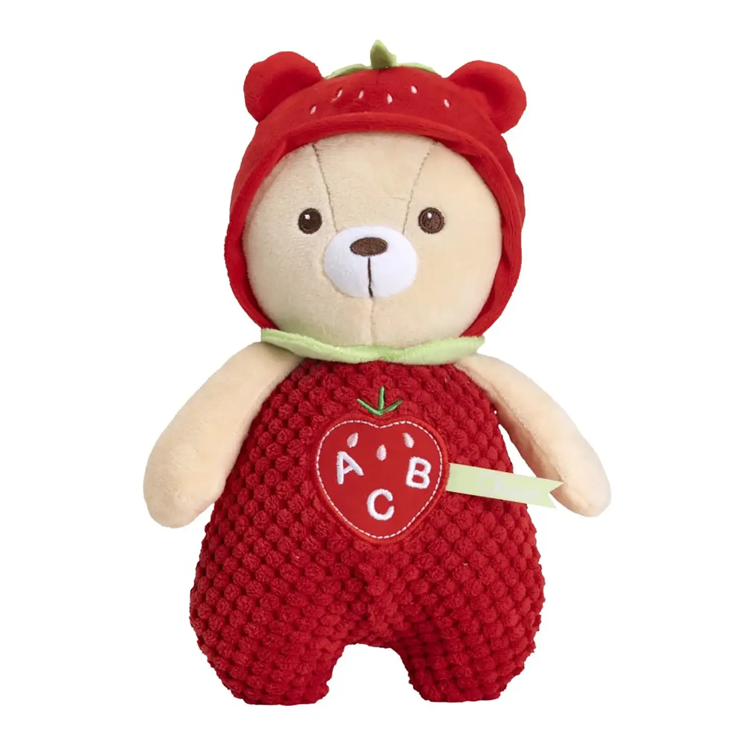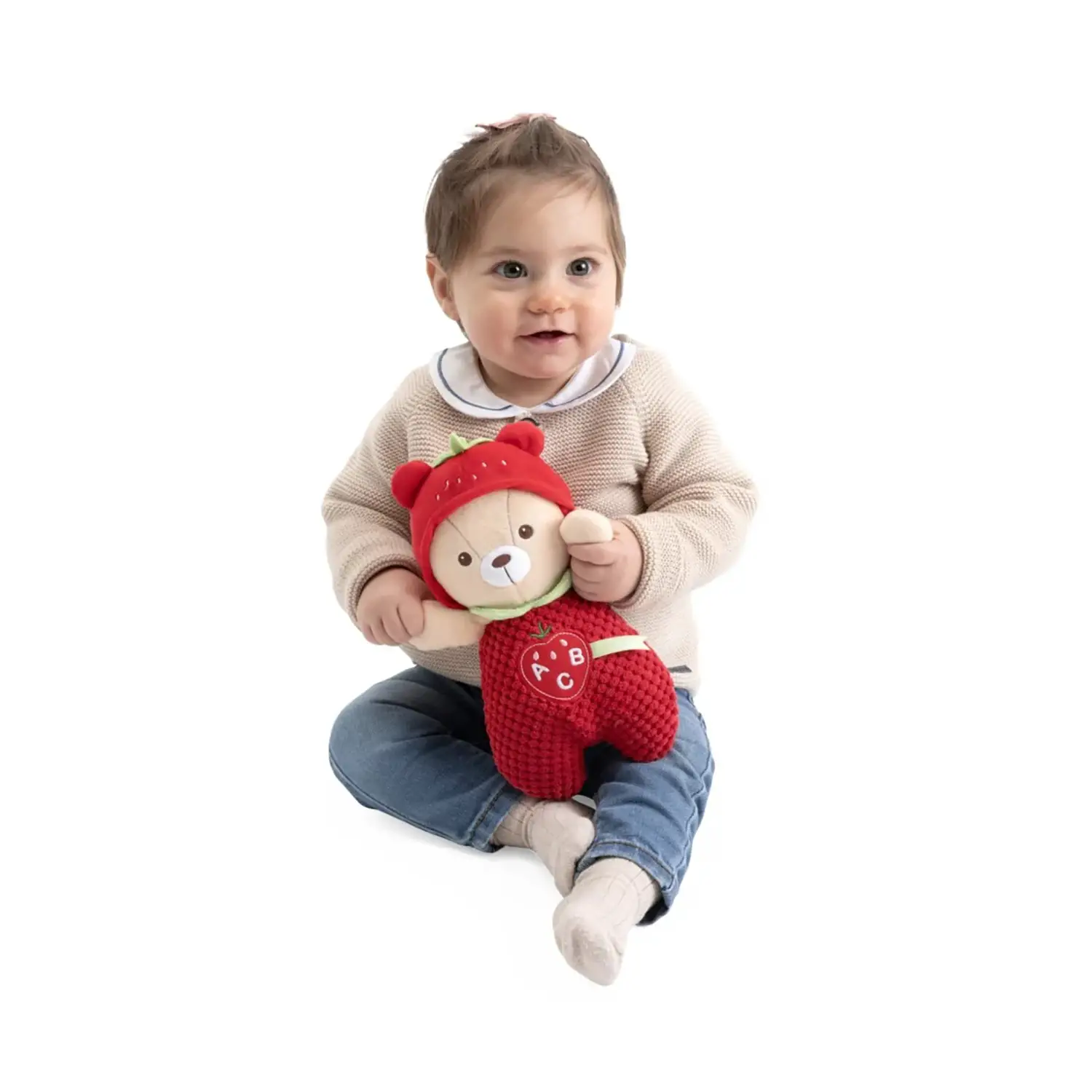 Design Dolce e Stimolante Il peluche ha un cappellino a forma di fragola, tessuti soffici e cuciture ricamate. I dettagli a rilievo stimolano anche il tatto, favorendo lo sviluppo multisensoriale.