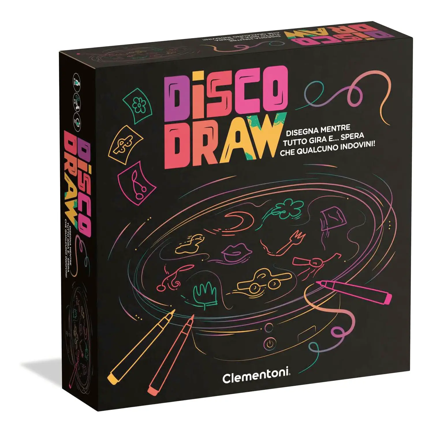 Scopri Disko Draw, il gioco da tavolo Clementoni che unisce disegno e movimento per sfide esilaranti tra amici e familiari. Disegna sulla lavagna girevole mentre tutti cercano di indovinare: ogni partita è una corsa contro il tempo e… contro il girare della lavagna!