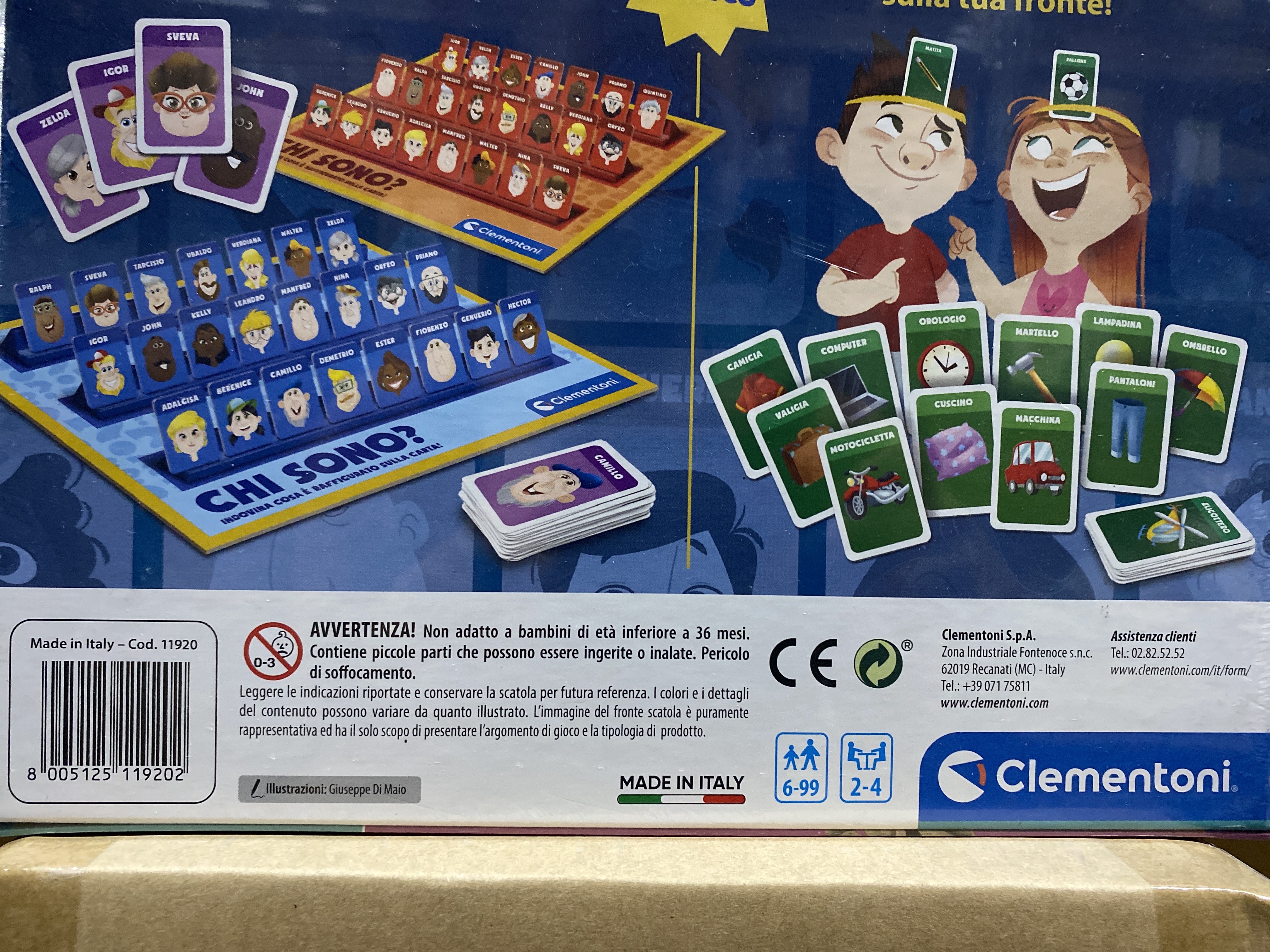 Chi sono? Gioco da tavolo Clementoni 11920: un gioco per piccoli investigatori in cui bisogna indovinare l’immagine raffigurata sulla carta. Per arrivare alla soluzione, basta fare semplici domande come “sono un maschio?”, “porto gli occhiali?” o “sono un oggetto?”.