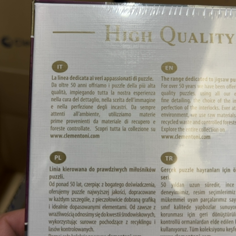 Qualità e Sostenibilità: Con la garanzia di qualità firmata Clementoni, questo puzzle è realizzato con materiali riciclati, evidenziando l’impegno dell’azienda verso la sostenibilità ambientale. La produzione Made in Italy assicura elevati standard di qualità e rispetto per l’ambiente.