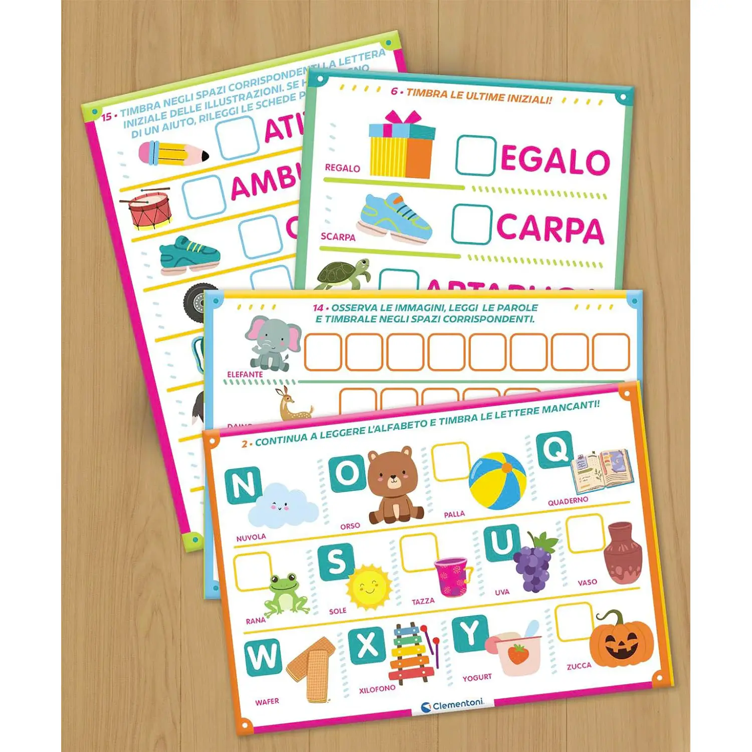 - ✅ Include 8 schede, 26 timbri, 32 tessere, tampone inchiostro e guida, ideale per bambini 4-6 anni.