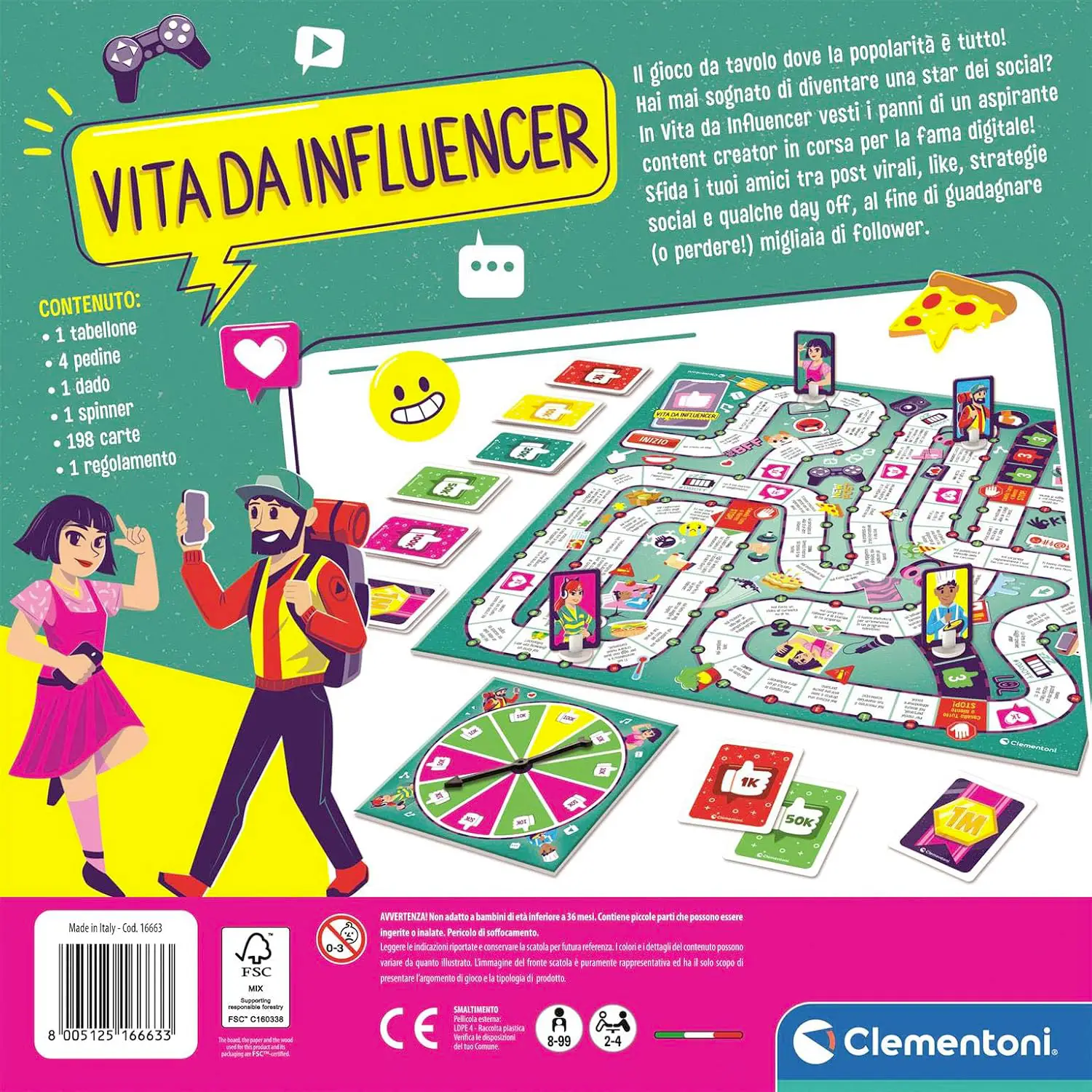 Vivi l’emozione con Vita da Influencer Scopri Vita da Influencer, il gioco da tavolo di CLEMENTONI. Diventa una star dei social, guadagna like e affronta sfide avvincenti. Ideale per chi ama strategia e colpi di scena. Imparare giocando con Clementoni Stimola pensiero strategico e creatività con Vita da Influencer. Affronta missioni social, unendo competizione e storytelling digitale. Un gioco coinvolgente per tutte le età. Come giocare a Vita da Influencer Lancia il dado, muovi la pedina e colleziona like. Evita imprevisti e raggiungi la popolarità. Vince chi accumula più follower senza perdere pubblico. Contenuto del gioco Clementoni Il gioco Made in Italy include tabellone, pedine, dado, spinner, carte e regolamento. Consigliato dai 6 anni in su, per vivere avventure da influencer.