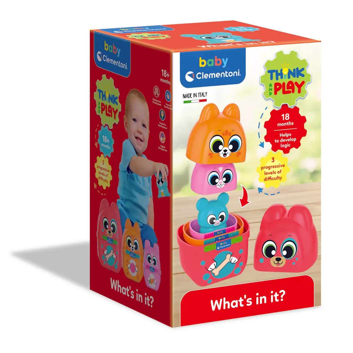 Clementoni Baby – La Matrioska degli Animali What’s Inside Un simpatico set di matrioske con teneri animali – cane, gatto, coniglio e topo – pensato per accompagnare i più piccoli alla scoperta di forme, colori e dimensioni.