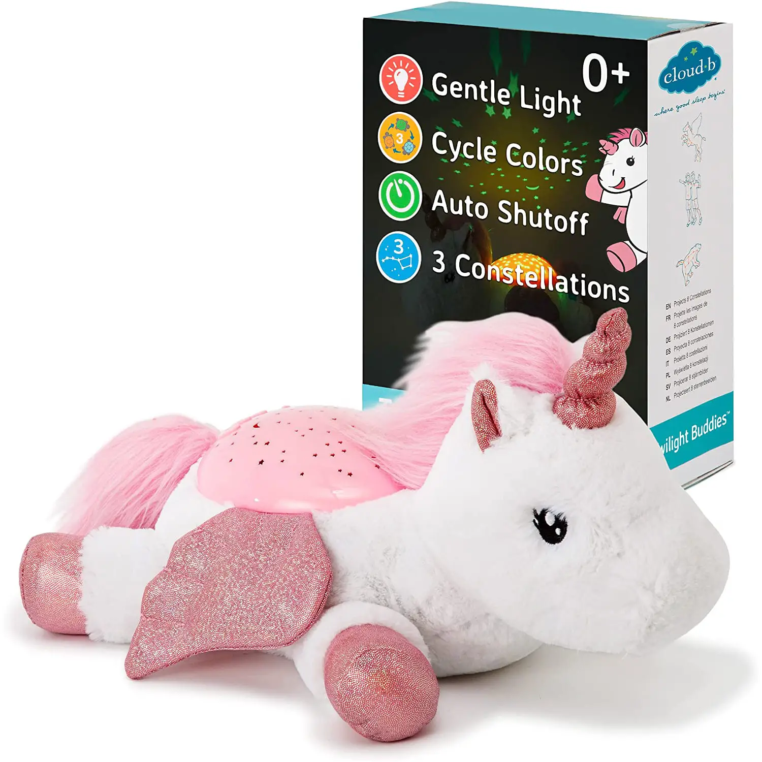 Lasciatevi la paura del buio alla spalle. L’unicorno alato trasforma una camera buia da inquietante a stellata con una schiena che proietta delle vere costellazioni sui soffitti e le pareti della camera. I genitori possono anche dare ai loro bambini una piccola lezione interattiva dopo che la luce si spegne. La guida stellare illustrata dell’unicorno consente di individuare i ‘Carri’ e l’Orsa’ che brillano sopra di voi. Caratteristiche: Il compagno di peluche proietta un cielo notturno stellato - Riduce la paura del buio - Proietta le attuali costellazioni di stelle.Il timer di 45 minuti garantisce il buio completo durante il sonno profondo dei bambini, come consigliato dai pediatri - Proietta 3 tipi di colori distensivi: blu, verde e ambra- guida stellare inclusa per identificare le costellazioni.