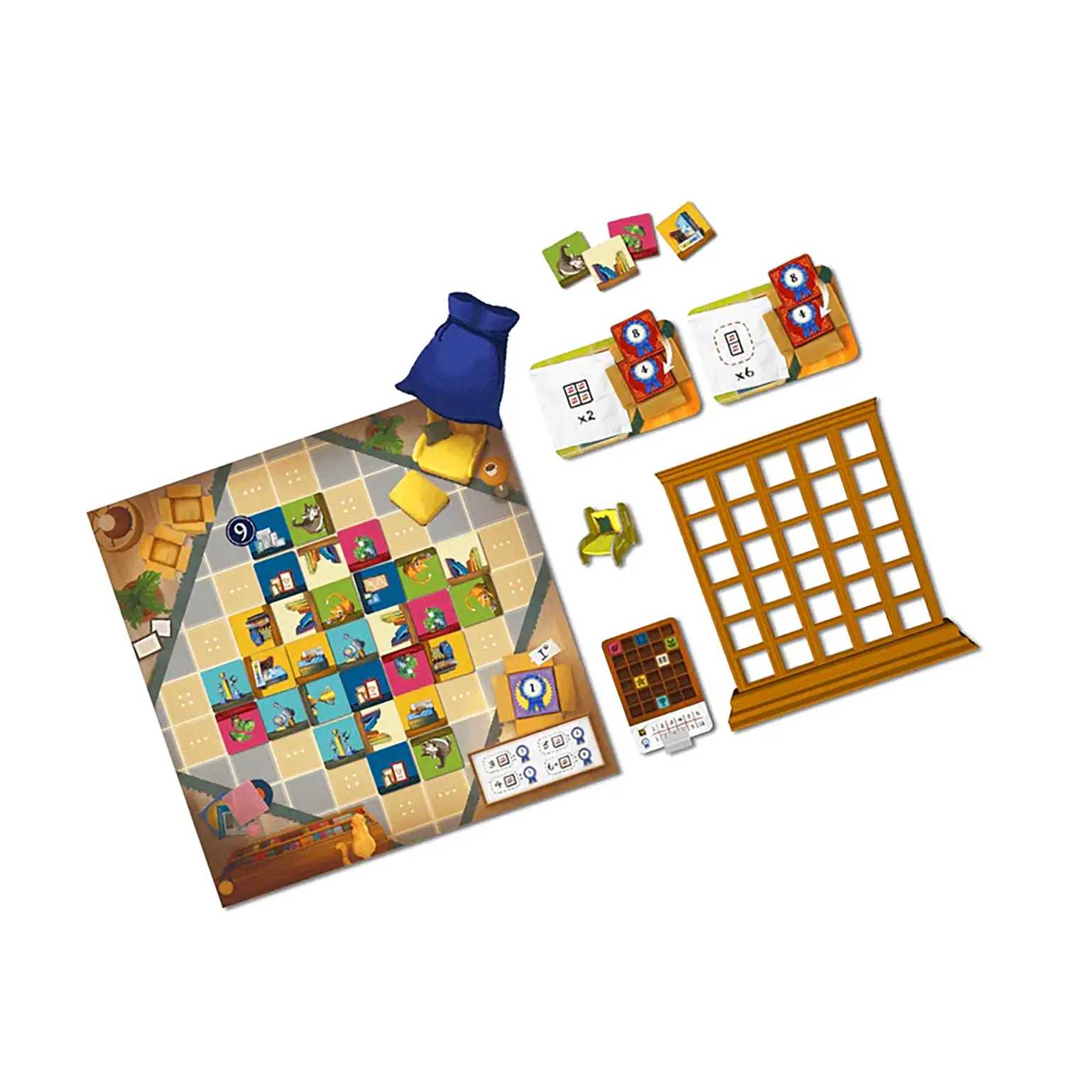 Contenuto completo della scatola La confezione include 4 librerie, 132 tessere Oggetto, 1 plancia di gioco, 12 carte Obiettivo Comune, 12 carte Obiettivo Personale, 1 sedia Primo Giocatore, 9 tessere Punteggio e 1 sacchetto in tessuto.