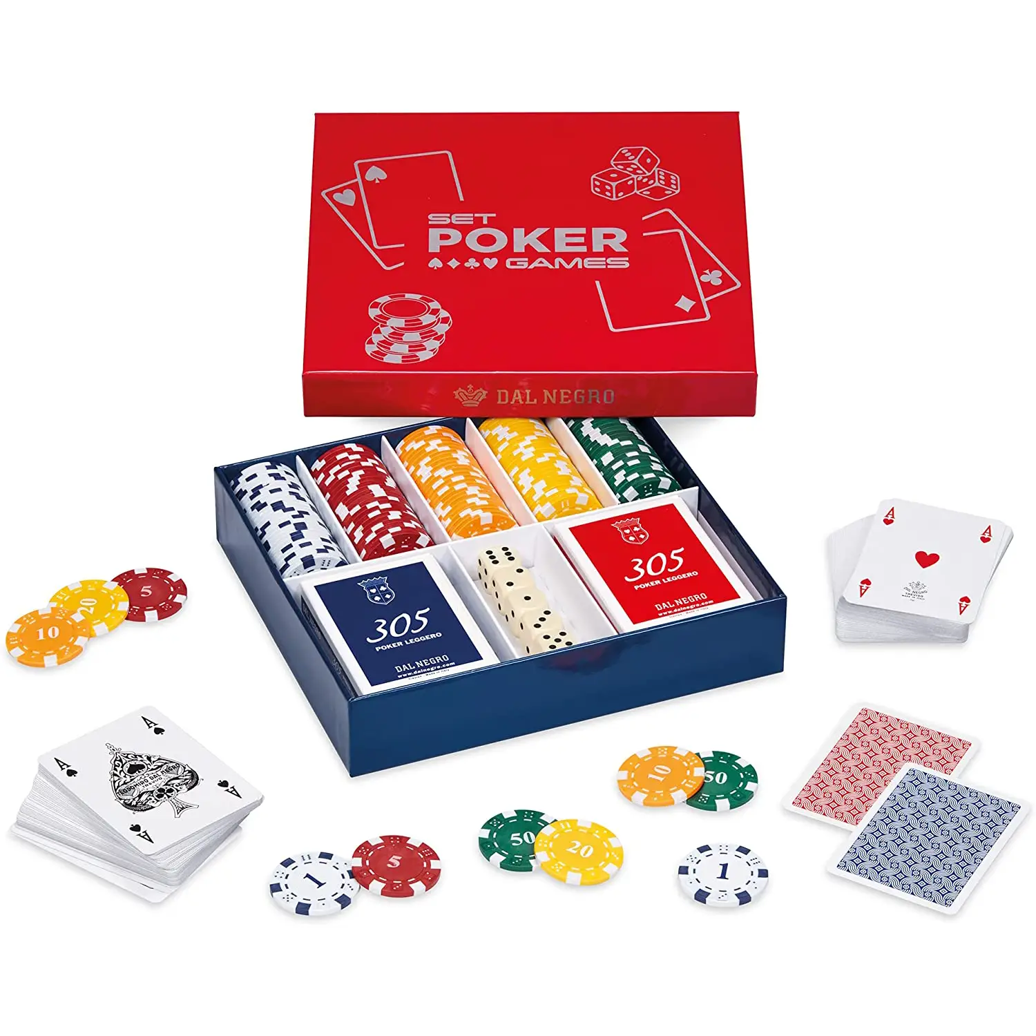 - Set Completo: Include 125 fiches in plastica ABS, 2 mazzi di carte da poker e 5 dadi, per giocare a poker, blackjack, roulette e altri giochi da casinò.