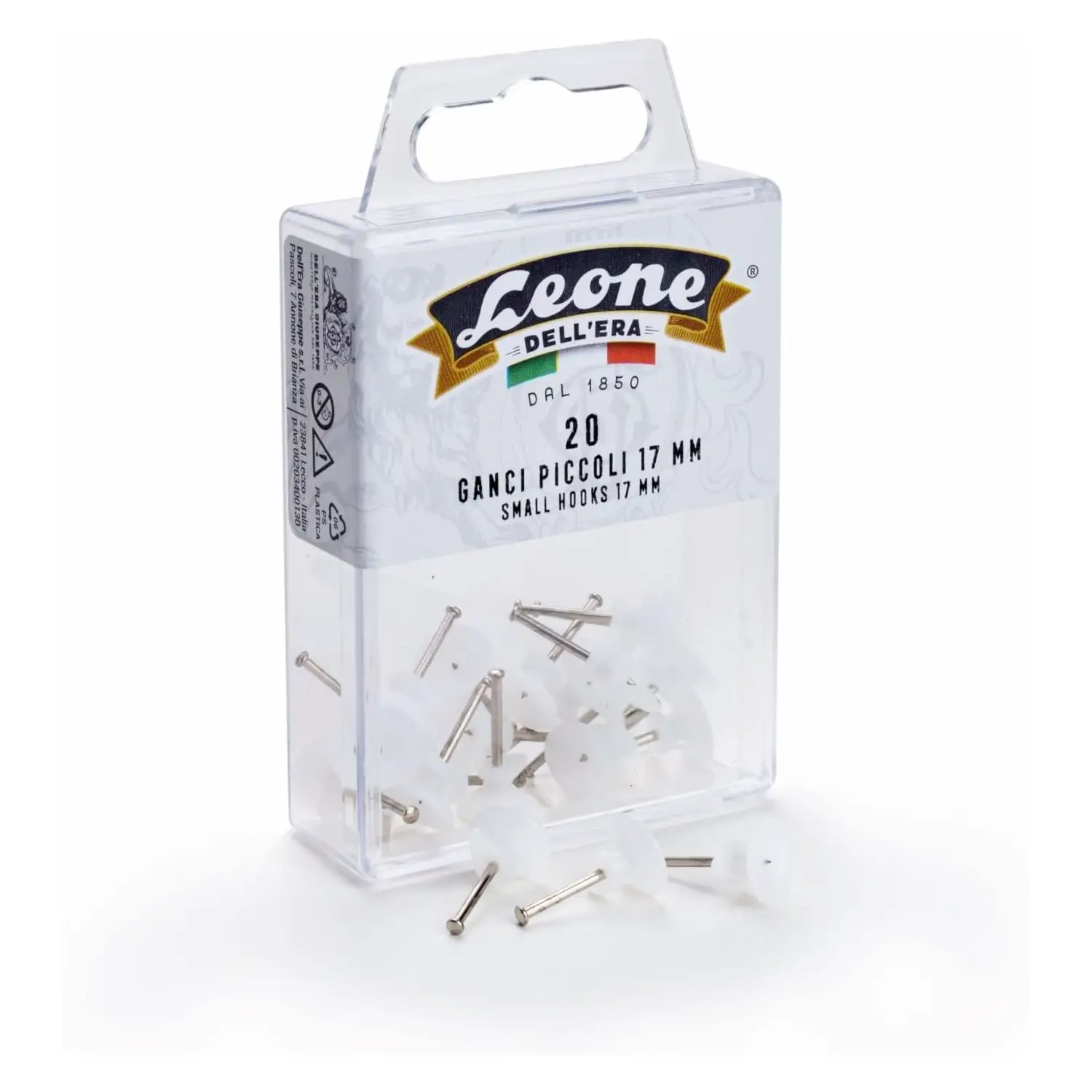 Leone Dell’Era – 20 Ganci Piccoli per Appendere Quadri I ganci piccoli Leone Dell’Era sono ideali per appendere quadri, cornici e decorazioni in modo pratico e sicuro. Grazie agli spilli in acciaio temprato, garantiscono un fissaggio stabile alla parete e una buona resistenza nel tempo, rendendoli perfetti per l’uso domestico o in ufficio.