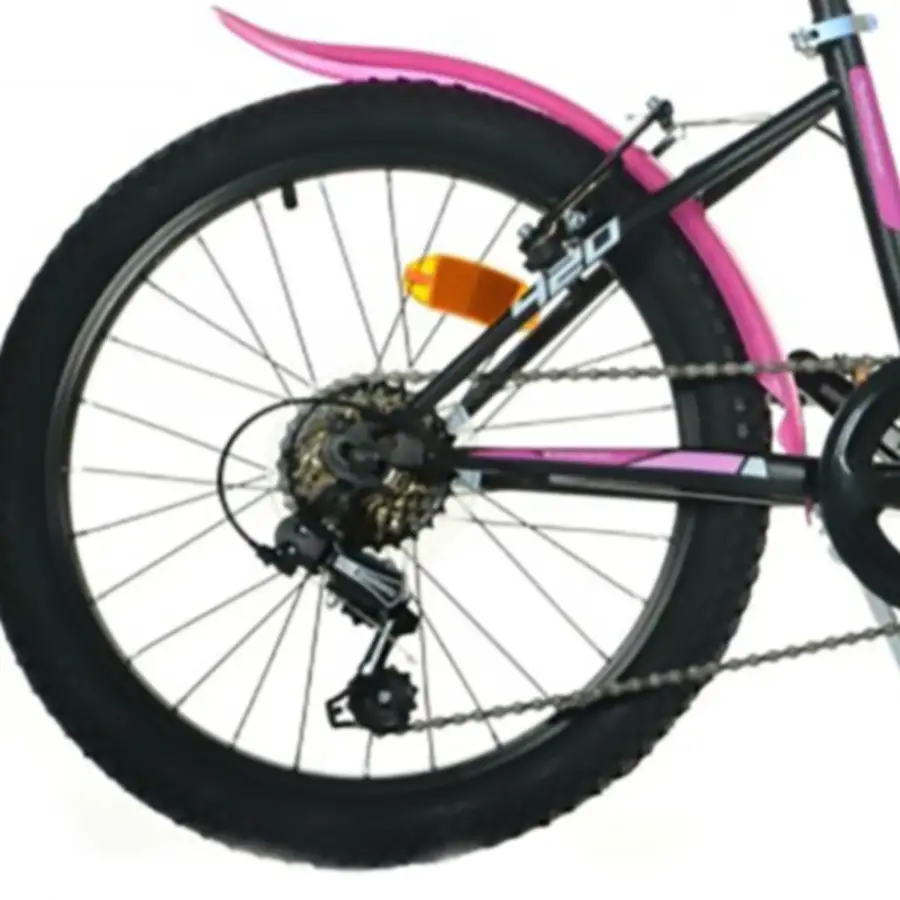 Il cambio a 6 velocità e il deragliatore posteriore permettono di affrontare salite impegnative e discese ripide con facilità. La ruota libera e la guarnitura in acciaio completano la trasmissione, garantendo una pedalata efficiente e veloce.
