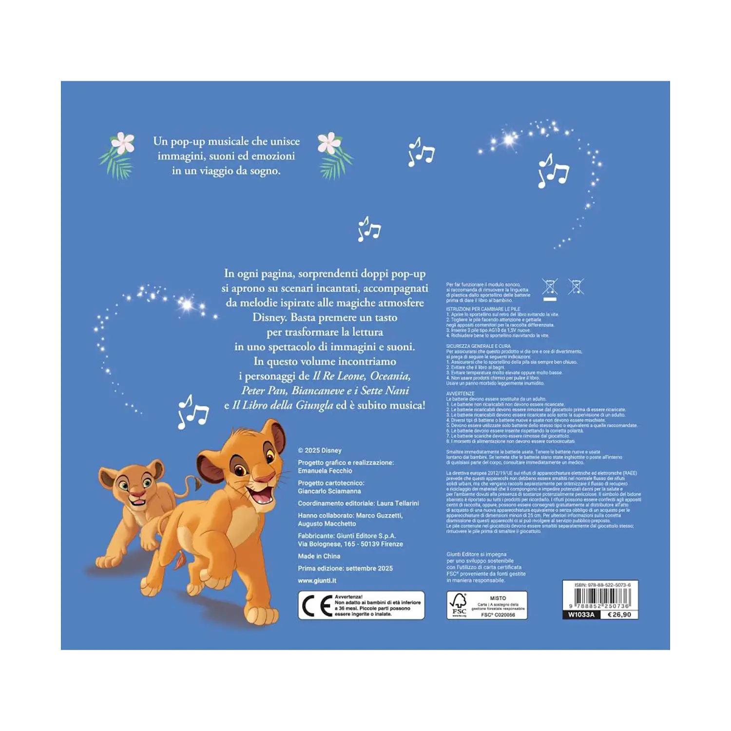 Pop-up tridimensionali spettacolari – Ogni pagina si apre in scenari 3D a tre livelli, dove i personaggi di Il Re Leone, Oceania, Peter Pan, Biancaneve e Il Libro della Giungla prendono vita tra colori vivaci e dettagli incantevoli.
